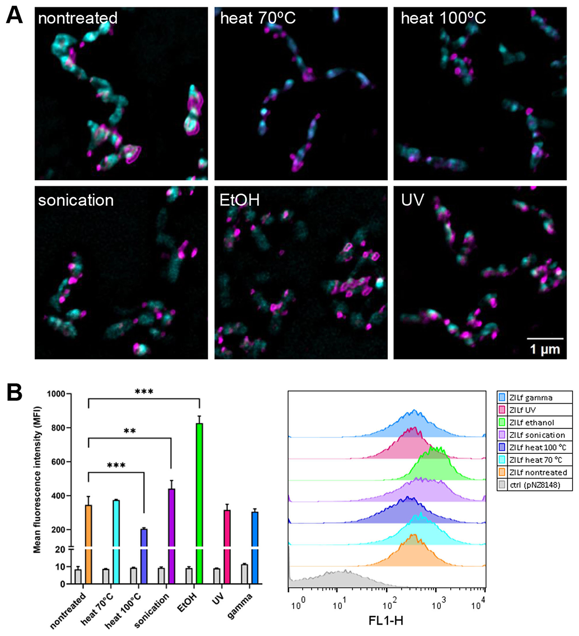 Figure 5. The distribution and the extent of surface display of ZIL6 affibody on non-viable recombinant L. lactis in comparison to the non-treated, live cells. (A) Representative confocal fluorescence microscopy images showing localization and distribution of ZIL6 affibody (magenta) on the surface of L. lactis (cyan) before and after treatment with heat (70 °C, 40 min or 100 °C, 30 min), sonication, ethanol, and UV irradiation. Bacterial cell membranes were stained with FM 1-43 lipophilic membrane probe. ZIL6 affibody was labeled with anti-flag primary antibody and Alexa Fluor 488-conjugated secondary antibody (for flow cytometry) or Alexa Fluor 555-conjugated secondary antibody (for microscopy). (B) Flow cytometric measurements of mean fluorescence intensities (MFI) in the population of 20 000 bacterial cells and representative intensity histograms for each treatment are depicted. The data are means ± SD of three technical replicates from a representative experiments. ZILf, L. lactis displaying ZIL6 affibody. Ctrl: L. lactis control cells harboring empty plasmid pNZ8148. **, p = 0.004; ***, p < 0.001 (one-way ANOVA with Dunnett multiple comparison test).