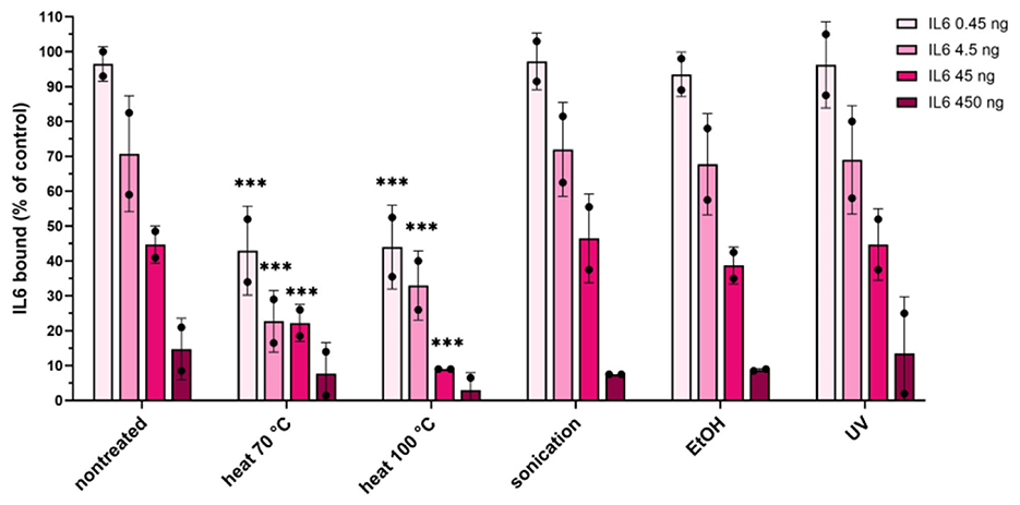 Figure 7. Quantification of the maximum binding capacity of ZIL6-displaying L. lactis. Increasing concentrations of recombinant human IL6 (0.45, 4.5, 45 and 450 ng) were incubated with a constant number of bacteria (4.5 × 107 CFU equivalent to 0.1 mg dry cell weight) in 450 μl. Residual IL6 in the supernatants was quantified by ELISA for live non-treated bacteria and the cells treated by heat (70 °C, 40 min or 100 °C, 30 min), sonication, ethanol, and UV irradiation. The percentage of bound IL6 was calculated from the difference measured in the presence of ZIL6-displaying L. lactis and control bacteria (carrying empty plasmid pNZ8148). The data are means ± SD of two biological replicates. The asterisks denote statistically significant differences between treated and non-treated bacteria for each concentration. ***, p < 0.001 (one-way ANOVA with Dunnett multiple comparison test).