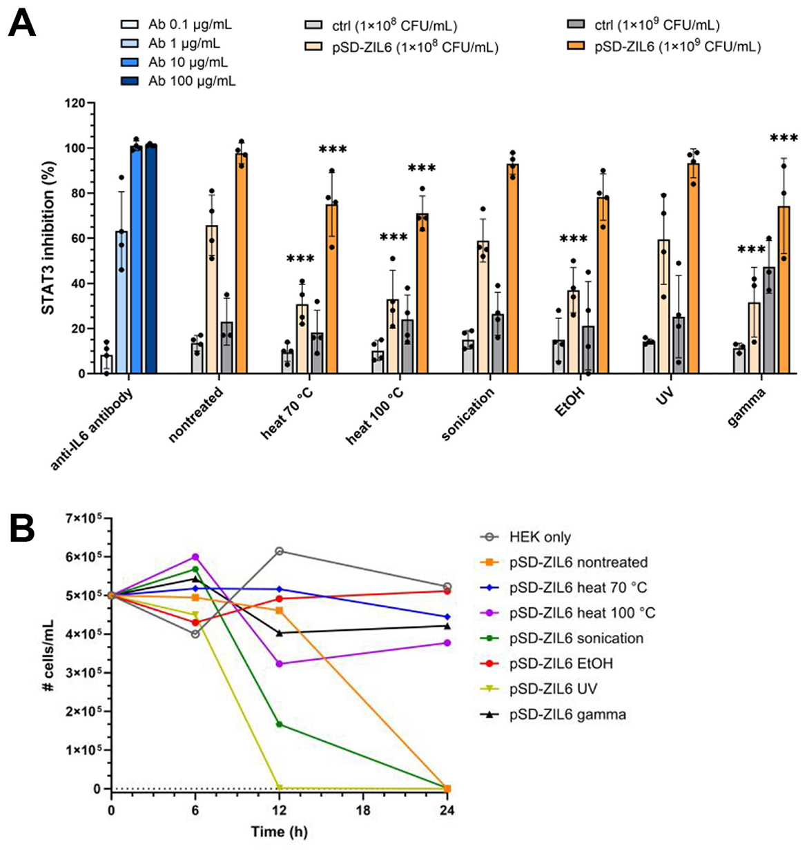 Figure 8. (A) Inhibition of STAT3 signaling in HEKblue-IL6R cells by non-viable ZIL6-displaying L. lactis bacteria in comparison to live non-treated strain. ZIL6-displaying L. lactis cells (1 × 108 CFU/mL or 1 × 109 CFU/mL) were preincubated with IL6 (1 ng/mL) for 2 h. After removal of bacterial cells, the cell-free supernatant containing remainder of IL6 was added to HEKblue-IL6R cells to induce the reporter system. The percentage of STAT3 inhibition was calculated relative to the STAT3 signaling induced by IL6 in the absence of bacteria. The inhibition of STAT3 signaling was determined for live non-treated bacteria and the cells treated by heat (70 °C, 40 min or 100 °C, 30 min), sonication, ethanol, UV, and gamma irradiation. pSD-ZIL6, L. lactis displaying ZIL6 affibody; Ctrl: L. lactis control cells containing empty plasmid pNZ8148. An anti-IL6 monoclonal antibody (Ab) was used as a positive control. The data are means ± SD of four biological replicates. The asterisks denote statistically significant differences between treated and non-treated bacteria for each concentration. ***, p < 0.001 (one-way ANOVA with Dunnett multiple comparison test). (B) The effect of lactic acid production by L. lactis on viability of HEKblue-IL6R cells. HEKblue-IL6R cells (100 000 cells/well) were incubated with ZIL6-displaying L. lactis (2 × 107 bacteria/well) for 6, 12, and 24 h, and the viability of HEKblue-IL6R cells was determined with trypan blue. The data are means ± SD of three technical replicates of a representative experiment.