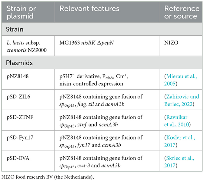 The bacterial strain and plasmids used in this study are listed in Table 1. The plasmids for surface display of cytokine binders were previously constructed by cloning in pNZ8148 the genes for respective cytokine-binding protein, each fused to lactococcal secretion signal Usp45 and anchoring domain cAcmA as described in (Ravnikar et al., 2010; Kosler et al., 2017; Skrlec et al., 2017; Zahirovic and Berlec, 2022). The constructed plasmids were transformed into Lactococcus lactis NZ9000 (recently renamed Lactococcus cremoris NZ9000) by electroporation using Gene Pulser II (Biorad, Hercules, CA, USA). For protein expression, overnight cultures of the recombinant L. lactis strains harboring the appropriate plasmids were diluted 1:50 in M17 medium (Merck, Darmstadt, Germany) supplemented with 0.5% glucose and 10 μg/mL of chloramphenicol. Bacteria were grown at 30 °C without shaking until they reached an early exponential growth phase (OD600 between 0.6 and 0.8) when nisin (10 ng/mL, Sigma) was added to induce protein expression. After 3 h of incubation, the cells were harvested by centrifugation (5,000 × g for 10 min at 4 °C) and resuspended in phosphate-buffered saline (PBS). OD600 was adjusted to 1.0, which was determined to correspond to 1 × 108 CFU/mL by culturing and enumeration of colony-forming units (CFUs). CFU counting was performed using a drop plate method by pipetting 10 μl drops of 10-fold serial dilutions of bacteria on agar plates. Following incubation at 30 °C for 48 h, colonies were counted and CFU/mL was calculated.