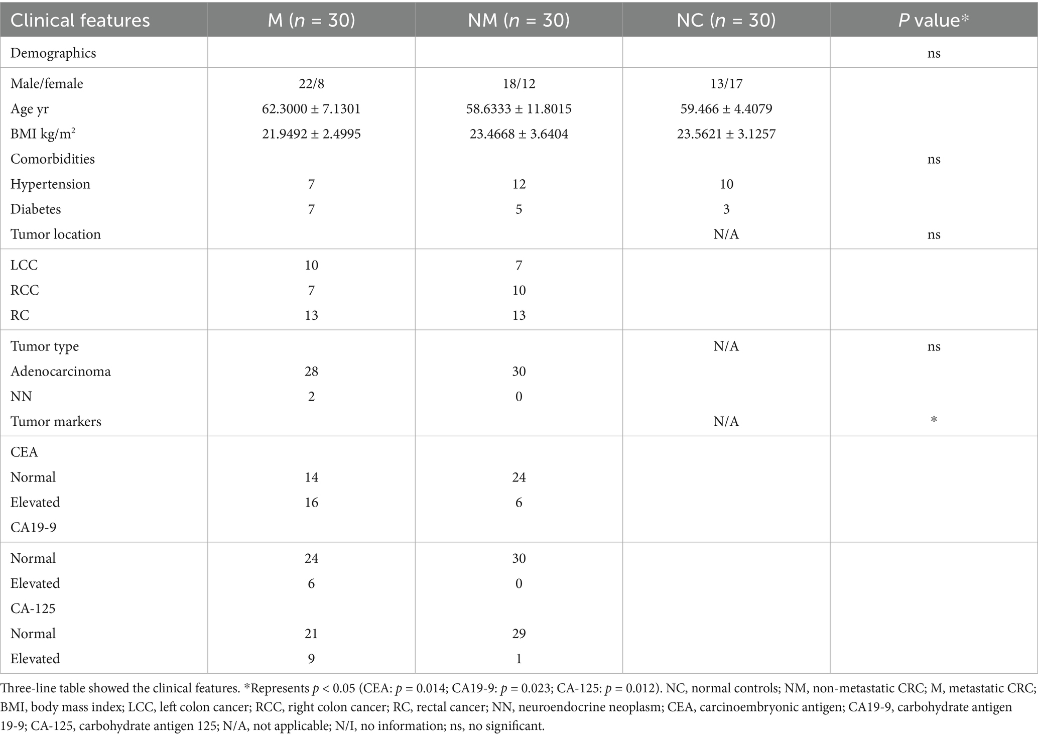 Based on strict inclusion criteria, 30 metastatic CRC patients (M group), 30 nonmetastatic CRC patients (NM group), and 30 healthy volunteers as normal controls (NC group) were included. Clinical features involving sex; age; BMI; comorbidities; location of primary tumor lesion; histological type; and serum CEA, CA-199, and CA-125 level were presented in the Table 1. The differences in demographic characteristics among the three groups were statistically insignificant. As for CRC patients, the specific distribution of their primary tumor location was as follows: NM group: 7 left colon cancer (LCC), 10 right colon cancer (RCC), and 13 rectal cancer (RC) as well as M group: 10 LCC, 7 RCC, and 13 RC. A total of 58 of patients were diagnosed with adenocarcinoma in terms of pathological classification, while only two of the M group patients were diagnosed with neuroendocrine neoplasms, thus showing consistency with the distribution characteristics of CRC histological types. In addition, serum tumor markers exhibited a significant difference between the M group and the NM group.