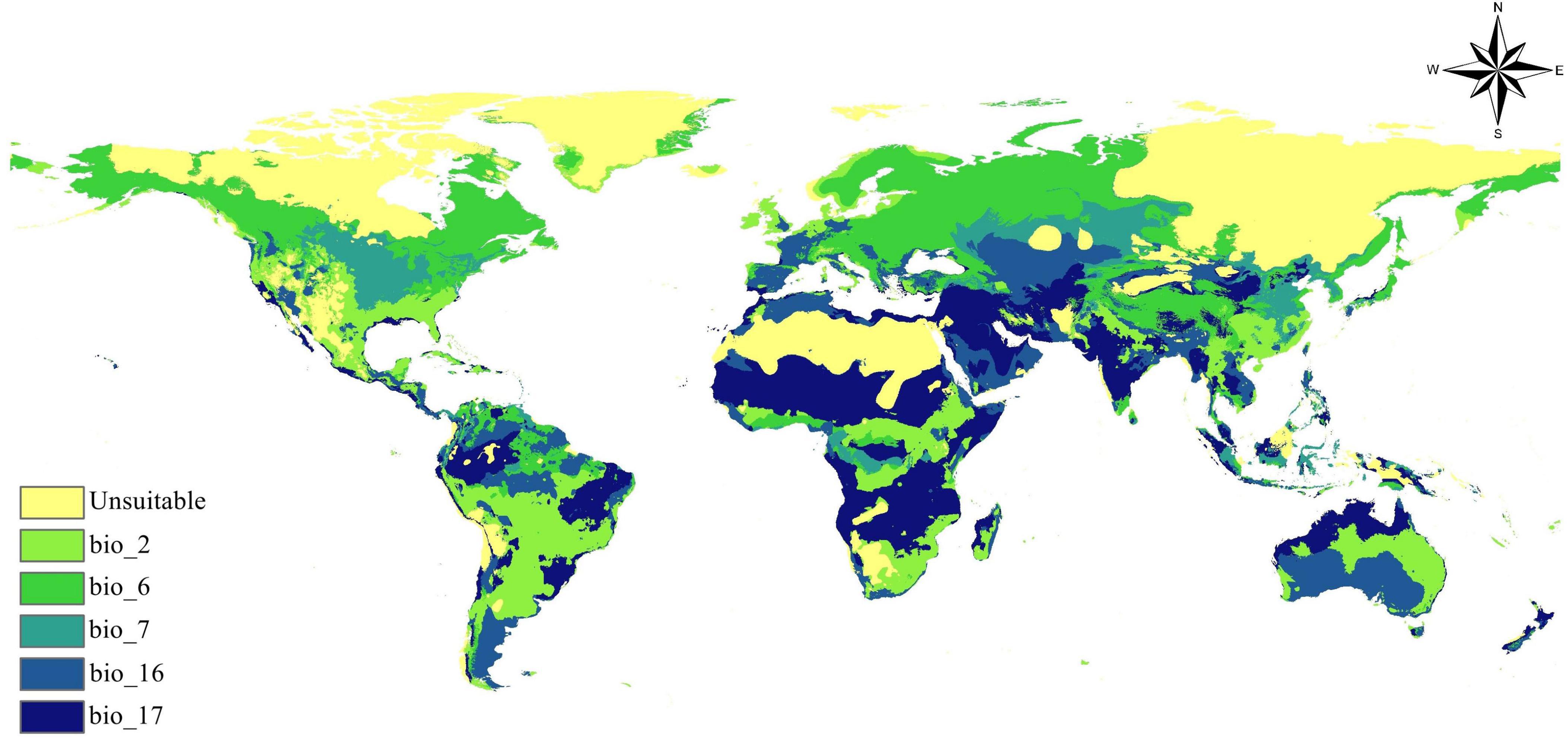 BIO_6 (Minimum Temperature of Coldest Month) was chosen despite its association with temperature factors, as extreme cold tolerance is a critical limiting factor for B. anthracis spore survival. This variable denotes the essential lower temperature threshold beneath which spore survival rates markedly decrease, crucial for forecasting distribution limitations at elevated latitudes and altitudes.