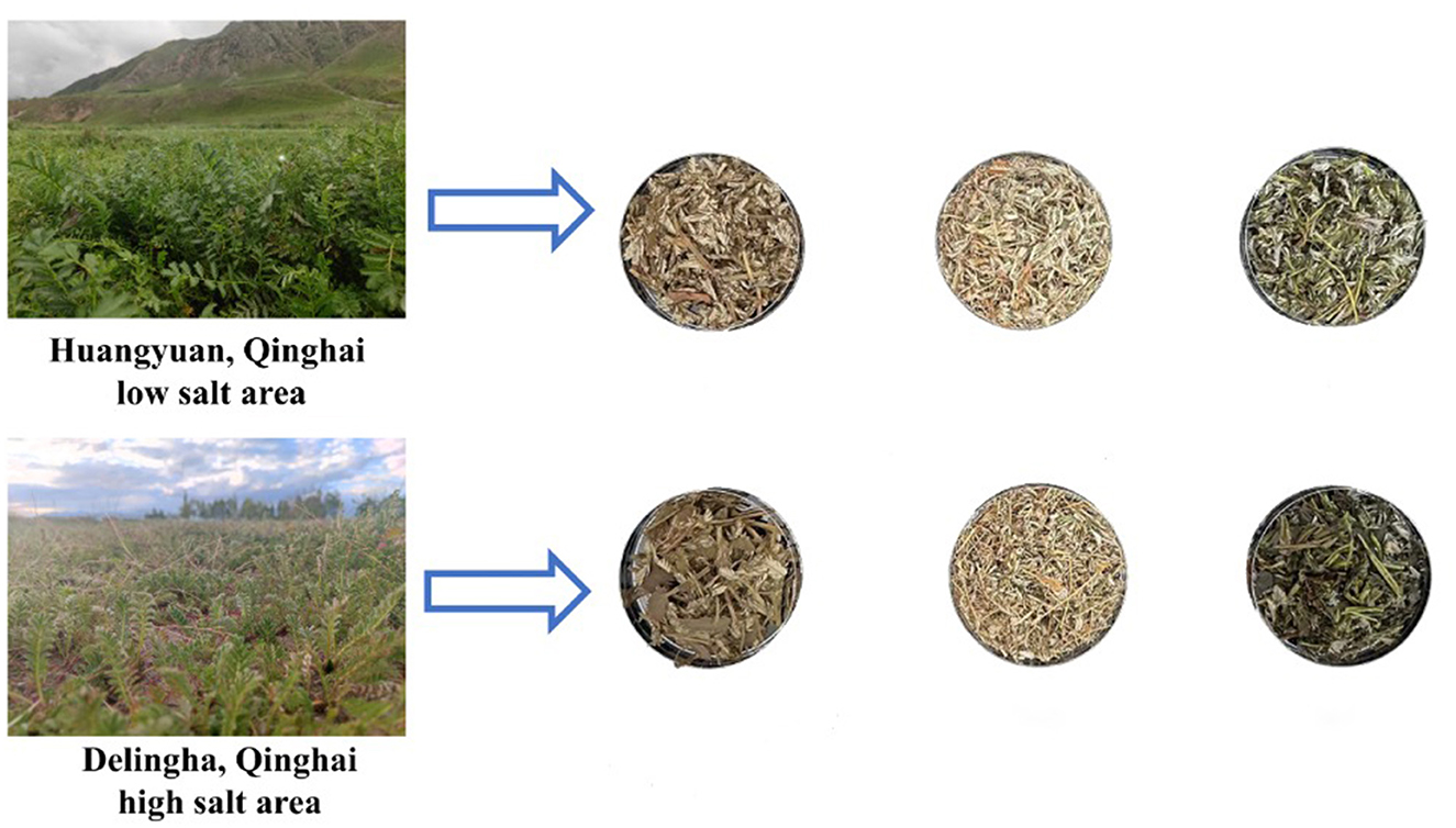 Potentilla anserina linnaeus (P. anserina) was collected on 28 July 2024 at two sites in Qinghai Province, China. Stem and leaves of P. anserina cultivar “Qinghai No. 6” were collected from a saline-alkali soil site in Delingha (D06; 37.2084°N, 97.3988°E) and a non-high-salt site in Huangyuan (H06; 36.5260°N, 101.1338°E). During the full bloom period of P. anserina, fresh leaves (HF) were harvested when the stubble height is 2 cm P. anserina was selected because of its use in Chinese medicine and its potential value as a functional feed supplement for ruminants. After collection of fresh material, sunlight was used to produce 30% dry matter before the leaves were chopped to a size of 2 cm (Li et al., 2022). Samples of 300 g, in triplicate, were placed in polyethylene plastic bags (dimensions 25 cm × 35 cm, China) and then vacuum sealed (45 d), producing 3 bags of normal silage samples (HS) and 3 bags of saline land silage samples (DS), while the other half was air-dried into hay, producing normal hay samples (HD) and saline land hay samples (DD), and stored together at room temperature (25–30 °C) (Figure 1).