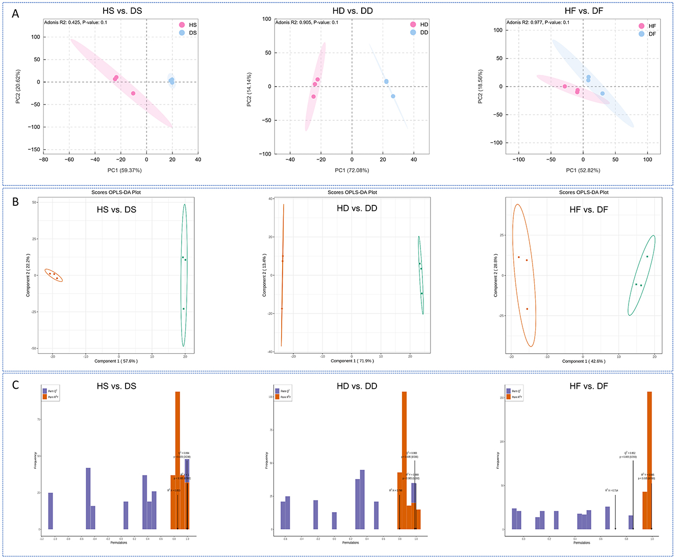 Panel A displays three PCA plots comparing HS vs. DS, HD vs. DD, and HF vs. DF, showing clusters in pink and blue with confidence ellipses. Panel B shows three OPLS-DA score plots for the same groups, with clear separation indicated by ellipses. Panel C presents permutation plots for each group comparison, with orange and purple bars indicating different frequency metrics.