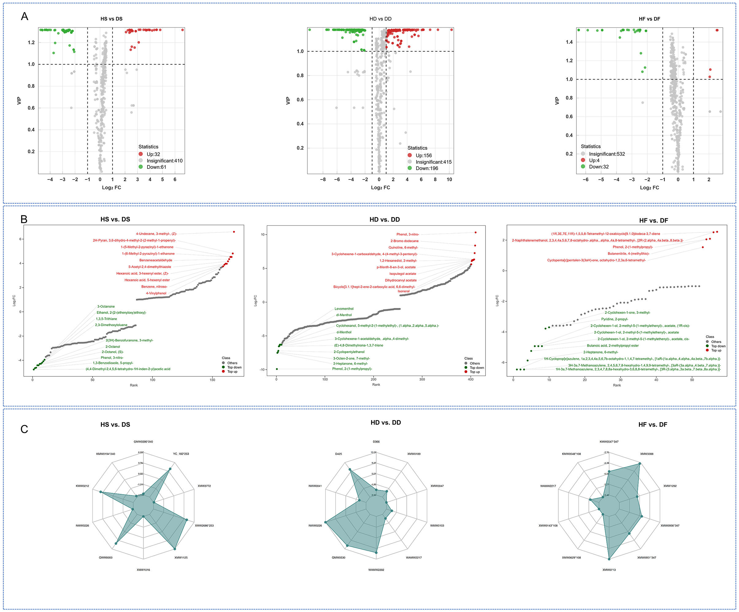 To prevent model overfitting, a 200-permutation test was performed prior to the OPLS-DA analysis. The constructed models demonstrated excellent predictive capability across all treatment groups. The respective R2X, R2Y and Q2 values were as follows: Silage treatment: HS vs. DS (R2X = 0.941, R2Y = 1, Q2 = 0.998); Dry treatment: HD vs. DD (R2X = 0.929, R2Y = 1, Q2 = 0.999); Fresh treatment: HF vs. DF (R2X = 0.953, R2Y = 1, Q2 = 0.997). All Q2 values exceeded 0.85, indicating robust model stability (Figures 4DF). These findings collectively demonstrate that high-salt conditions significantly alter the volatile metabolite profiles of P. anserina when processed in different ways.
