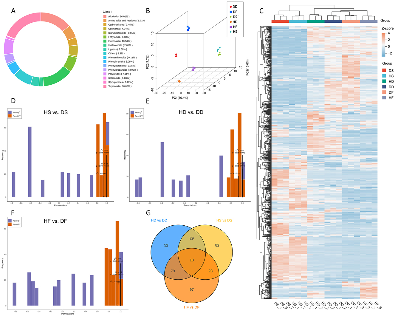 Figure 4. Ring chart of the proportion of all non-volatile metabolite categories (A), Princi P. anserina component analysis (B), Heat map of metabolite levels in P. anserina from different processes (C), validation plots of the OPLA-DA model for non-volatile metabolites in the HS vs. DS (D), validation plots of the OPLA-DA model for non-volatile metabolites in the HD vs. DD (E), validation plots of the OPLA-DA model for non-volatile metabolites in the HF vs. DF (F), Venn diagram of differential nonvolatile metabolites for the comparison groups (G). HF represents the low-salt fresh samples, HD represents the low-salt dry grass, HS represents the low-salt silage, DF represents the high-salt fresh samples, DD represents the high-salt dry grass, and DS represents the high-salt silage.