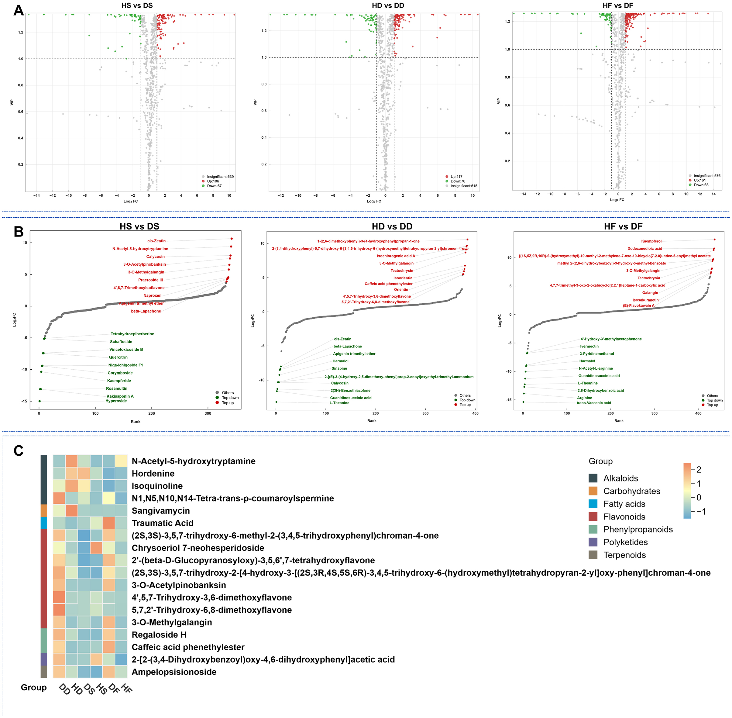Three sections visualize metabolite data. Section A shows volcano plots comparing HS vs DS, HD vs DD, and HF vs DF. Section B displays ranked plots with significant metabolites in red. Section C is a heatmap categorizing metabolites into groups like alkaloids and flavonoids, with colors indicating expression levels.