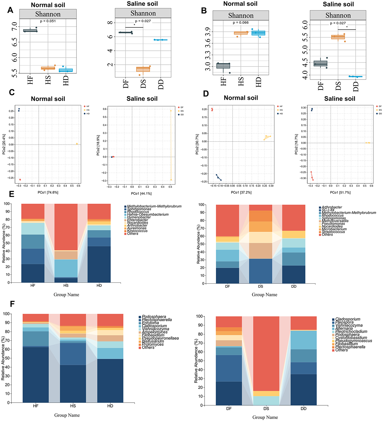 Box plots and bar graphs show the Shannon diversity index and relative abundance of bacterial and fungal communities in normal and saline soils. Panels A and B display Shannon diversity for different treatments: HF, HS, HD, DF, DS, and DD. Panels C and D present Principal Coordinate Analysis (PCoA) for bacterial and fungal communities. Panels E and F depict the relative abundance of various genera for each treatment, highlighting differences between normal and saline soils. Each genus is color-coded for clarity.