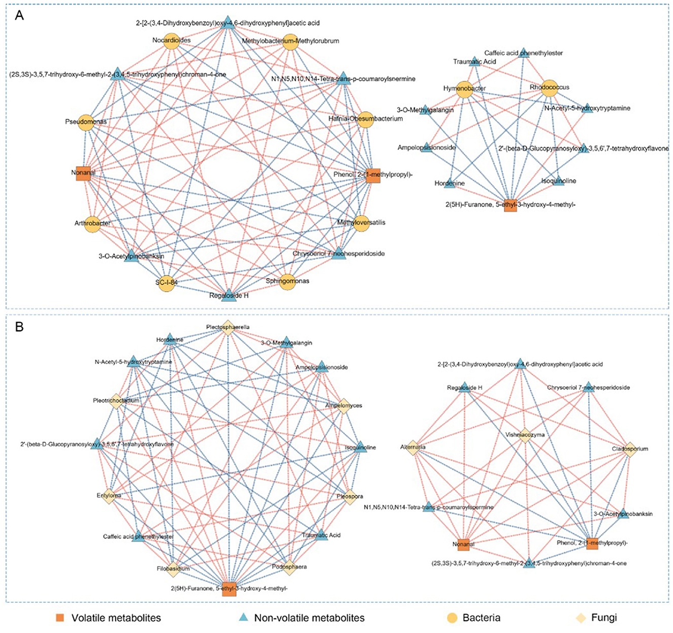 Figure 7. Correlation network analysis of bacteria (A) and fungi (B) in P. anserina with respect to volatile and non-volatile compounds. Where the red line represents significant positive correlation (ρ < 0.05, r > 0.6), the blue line represents significant negative correlation (ρ < 0.05, r < − 0.6), the thickness of the line represents the strength of the correlation; the size of the node represents the magnitude of the degree of connectivity. (For interpretation of the references to color in this figure legend, the reader is referred to the web version of this article).