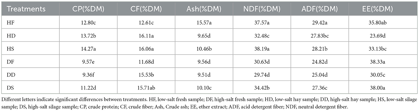 In this study, the chemical compositions of fresh grass, hay and silage under low-salt and high-salt habitats were compared (Table 1). This study found that the crude protein (CP) content in saline-alkali soil (9.57% DF; 9.36% DD; 11.22% DS) was lower than in normal soil (12.80% HF; 12.80% HD; 14.27% HS) (P < 0.05), particularly in hay. However, the CP content increased after ensiling, regardless of whether the soil was normal or saline-alkali (P < 0.05). The levels of crude fiber(CF; 12.61% HF; 16.11% HD; 16.06% HS; 9.57% DF; 9.36% DD; 11.22% DS), neutral detergent fiber (NDF; 37.57% HF; 32.48% HD; 38.19% HS; 30.63% DF; 29.74% DD; 34.42% DS) and acid detergent fiber (ADF; 29.42% HF; 27.83% HD; 28.21% HS; 24.82% DF; 25.04% DD; 27.36% DS) in saline-alkali soil are all lower than in normal soil (P < 0.05). The content of ether extract (EE) is higher under saline-alkali (38.33% DF; 30.05% DD; 38.00% DS) conditions than under normal soil conditions (35.80% HF; 23.69% HD; 33.13% HS). Furthermore, the EE content in saline-alkali soil after silage is not significantly different from that in fresh leaves (P > 0.05). The ash content of the other treatments was found to be significantly different from that of HF (15.57%) (P < 0.01).