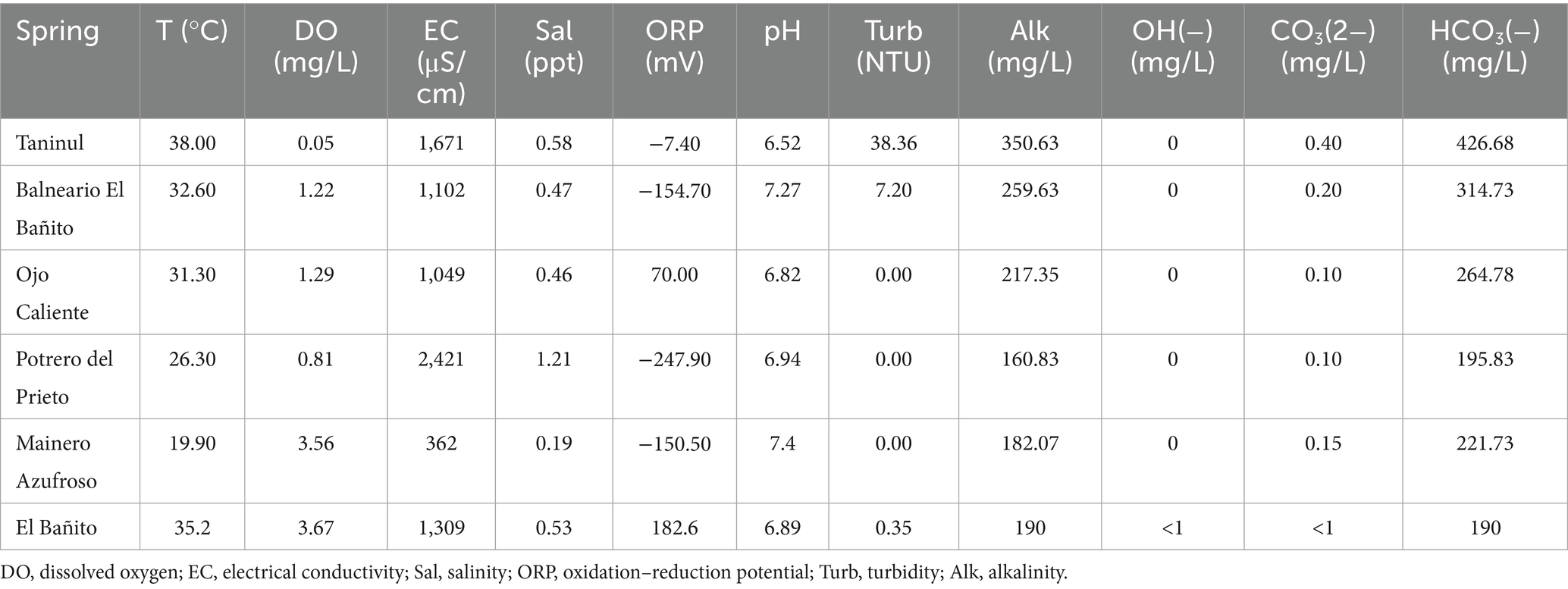 Results: Our analysis identified a total of 425 microbial species, which included 409 bacterial species, 13 eukaryotic organisms, and 3 archaeal taxa. The Ojo Caliente and Mainero Azufroso springs displayed the highest microbial diversity, whereas the Balneario El Bañito and Taninul springs exhibited the lowest. The Phyum Pseudomonadota was the predominant across the majority of springs, while Campylobacterota and Chlorobiota were specifically identified in the less diverse Balneario El Bañito and Taninul springs, respectively. A total of 30 indicator species were identified, predominantly in El Bañito and Potrero Prieto springs, emphasizing the distinctiveness of their microbial environments. Moreover, we found that electrical conductivity and bicarbonate concentration had a significant impact on the structure of this microbial communities.