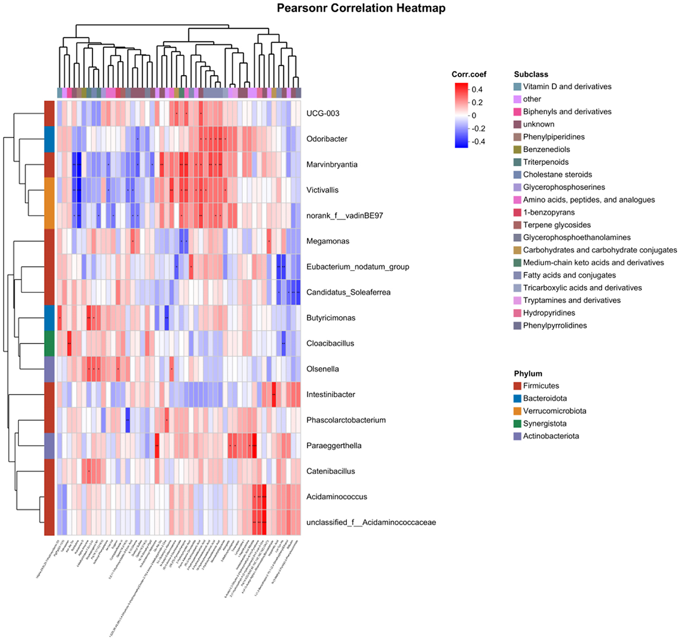 A Pearson correlation analysis was conducted on the differential microbial taxa and differential metabolic characteristic sets for kidney Yang deficiency type and spleen-kidney Yang deficiency type OP. The results showed that the characteristic microbiota of kidney Yang deficiency type OP, specifically the genus Intestinibacter, was positively correlated with 4-(4′-O-Acetyl-Alpha-L-Rhamnosyloxy)Benzaldehyde (r = 0.41, P < 0.01). Meanwhile, the genus Phascolarctobacterium was negatively correlated with Gpetn (18:2/16:0; r = −0.37, P < 0.01) and positively correlated with 1- [(2S,3R,4S,5R)-3,4-Dihydroxy-5-(Hydroxymethyl)Oxolan-2-Yl]-4-Imino-3-Methylpyrimidin-2-One (r = 0.29, P < 0.05). For spleen-kidney Yang deficiency type OP, the characteristic microbiota genus Olsenella was positively correlated with Alpha-Amyrone (r = 0.31, P < 0.05), 4-Methylcholest-7-En-3-Ol (r = 0.29, P < 0.05), Soyasapogenol M1 (r = 0.28, P < 0.05), Eugenin (r = 0.27, P < 0.05), and 5-L-Glutamyl-L-Alanine (r = 0.26, P < 0.05; Figure 8).