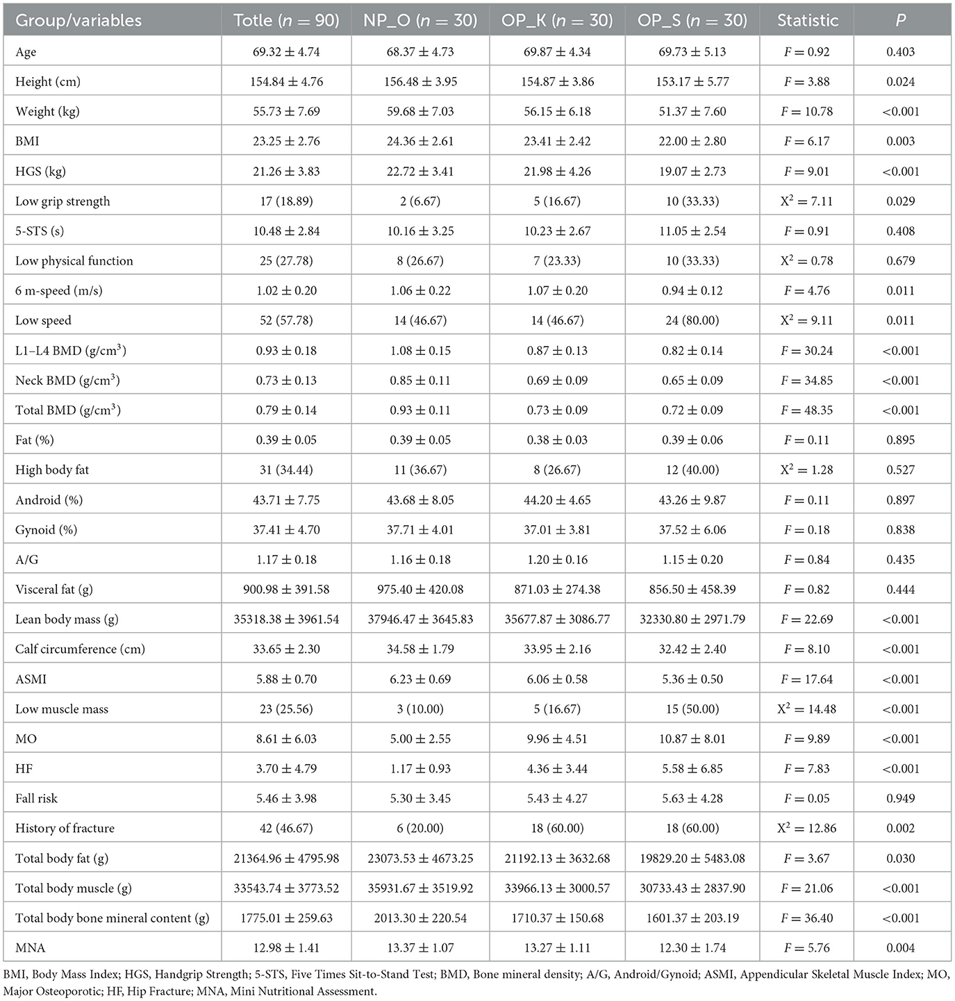 We categorized OP into two types: kidney Yang deficiency type (OP-K) and spleen-kidney Yang deficiency type (OP-S), with average ages of 69.87 and 69.73 years, respectively. Compared to elderly women without OP, women with kidney Yang deficiency type OP and those with spleen-kidney Yang deficiency type OP exhibited significantly lower height, weight, and BMI, with the spleen-kidney Yang deficiency type showing even lower values (P < 0.05). In terms of muscle mass and functional assessment, women with OP demonstrated significantly reduced maximum grip strength, prolonged time to complete five sit-to-stand transitions, and slower 6-meter walking speed compared to elderly women without OP. Furthermore, women with spleen-kidney Yang deficiency type OP had lower maximum grip strength, longer sit-to-stand times, and slower walking speeds compared to those with kidney Yang deficiency type OP. Among women with kidney Yang deficiency type OP, 16.67% had low grip strength, 23.33% had poor physical function, and 46.67% had reduced walking speed, whereas these rates were significantly higher at 33.33%, 33.33%, and 80%, respectively, in women with spleen-kidney Yang deficiency type OP. Regarding BMD, women with spleen-kidney Yang deficiency type OP exhibited lower densities in L1–L4, femoral neck, and total hip compared to those with kidney Yang deficiency type OP, along with higher clinical symptom scores. In terms of fat and muscle mass, both elderly women without OP and those with OP had elevated body fat levels at 39% and 38%, respectively, and there were no significant changes in the ratio of abdominal to gluteal fat or visceral fat mass. Compared to elderly women without OP, both groups of women with OP had reduced lean body mass, ASMI, and calf circumference, with women in the spleen-kidney Yang deficiency type having lower values than those in the kidney Yang deficiency type. In terms of the risk of falls and fractures, both groups of women with OP showed increased risks of falls, major fractures, and hip fractures compared to elderly women without OP, with the spleen-kidney Yang deficiency type showing a greater increase. The rate of previous fractures among both groups of women with OP reached 60%, compared to 20% in elderly women without OP. Regarding body composition, both groups of women with OP exhibited significant reductions in total body fat, muscle, and bone mineral content, with the spleen-kidney Yang deficiency type showing greater decreases. In the evaluation of nutrition and quality of life, women with spleen-kidney Yang deficiency type OP had significantly lower nutrition scores (P < 0.01), suggesting the possibility of poor nutritional status. Compared to elderly women without OP, both groups of women with OP showed significantly lower scores in social functioning, and women with spleen-kidney Yang deficiency type OP had significantly lower energy scores compared to those with kidney Yang deficiency type OP (Table 1).