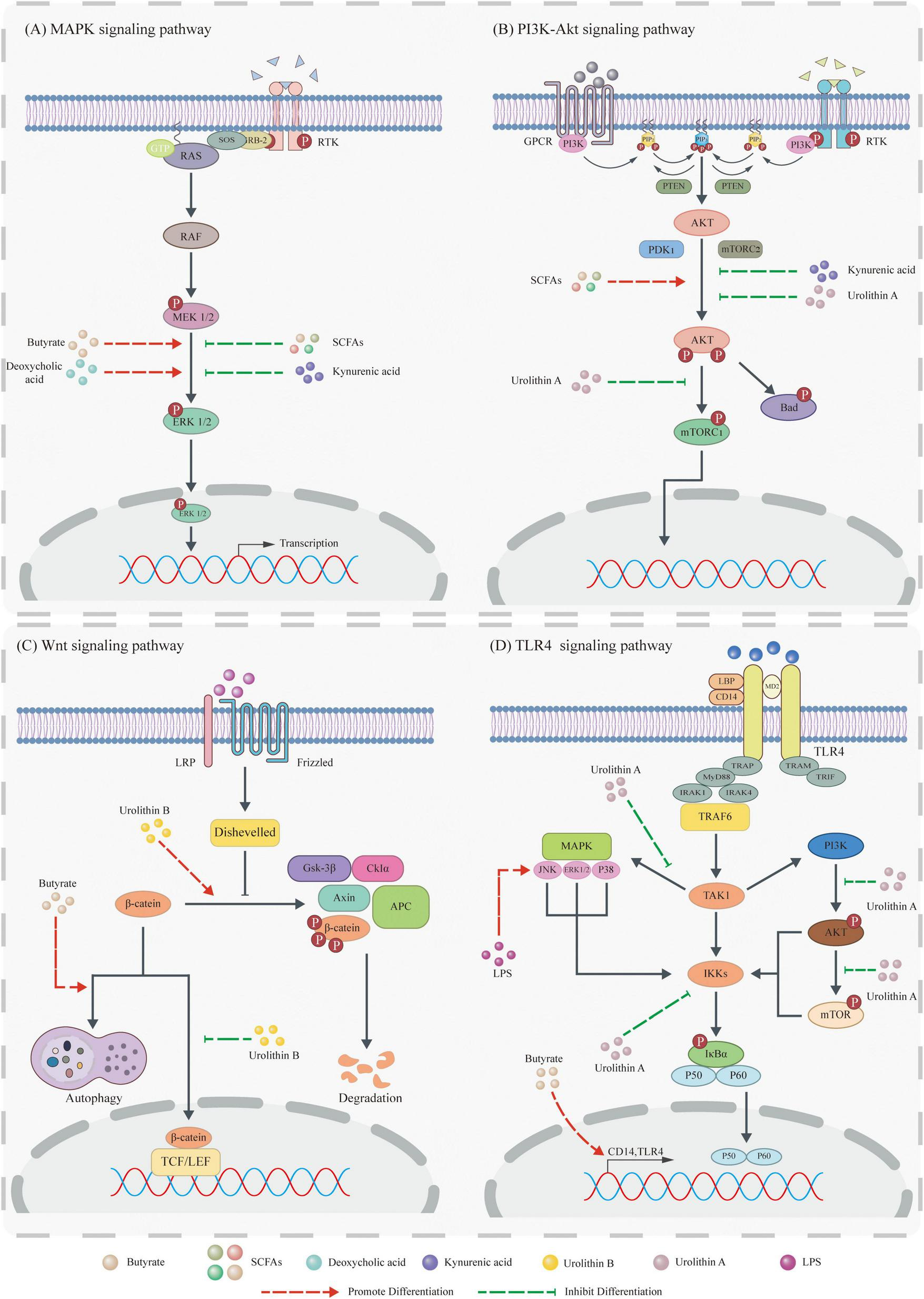 Gut microbiota metabolites influence tumor development by modulating signaling pathways. (A) Mitogen-activated protein kinase (MAPK) pathway: Butyrate and DCA activate the MAPK pathway by promoting Extracellular regulating kinase (ERK) phosphorylation, whereas SCFAs and Kynruenic acid (KYNA) suppress this pathway by inhibiting ERK phosphorylation. (B) PI3K pathway: SCFAs activate the PI3K pathway via Protein Kinase B (Akt) phosphorylation. In contrast, KYNA inhibits it by suppressing Akt phosphorylation, and Uro A downregulates it through inhibition of both Akt phosphorylation and mammalian target of rapamycin complex 1 (mTORC1) complex activity. (C) Wnt pathway: Butyrate inhibits Wnt pathway activation by degrading β-catenin via the autophagy-lysosomal pathway, while Urolithin B (Uro B) promotes its degradation through the proteasomal pathway. Additionally, Uro B suppresses β-catenin nuclear translocation to further inhibit this pathway. (D) TLR4 pathway: LPS activates the downstream JNK pathway via TLR4 signaling. Uro A collectively inhibits the TLR4 pathway by: (1) blocking phosphorylation of ERK, p38, and JNK (MAPKs), (2) inhibiting phosphorylation of Akt and mTOR proteins, and (3) reducing Inhibitor of NF-κB kinase (IKK) activity.