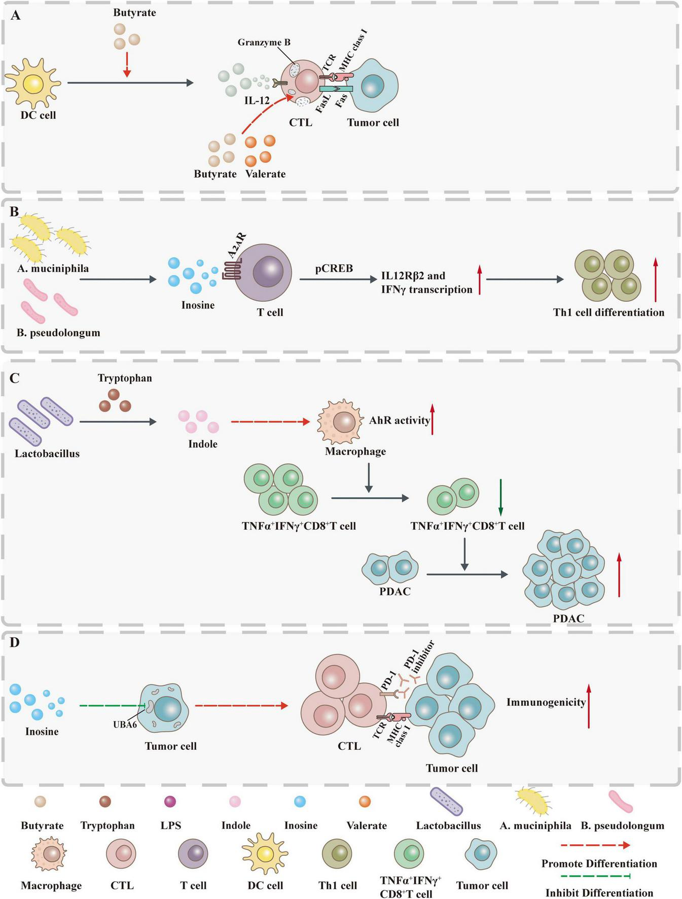 Gut microbiota metabolites influence tumor development by controlling immunity. (A) Butyrate not only promotes GzmB production through ID2-dependent IL-12 signaling but also directly induces GzmB expression. (B) Inosine acts on A2AR on T lymphocytes to stimulate phosphorylation of cAMP response element binding protein (pCREB) through the inosine-A2AR-cAMP-PKA signaling pathway, up-regulate IL12Rβ2 and IFNγ transcription, and promote Th1 cell differentiation and accumulation in the TME. (C) Indole increases AhR activity in tumor-associated macrophages (TAMs) and inhibits the accumulation of TNFα+IFNγ+CD8+ T cells within the tumor, thereby promoting the growth of PDAC. (D) Inosine not only enhances the sensitivity of tumor cells to T cell-mediated cytotoxicity by inhibiting the ubiquitin-activating enzyme UBA6 but also directly enhances the ability of tumor cells to present tumor antigens.