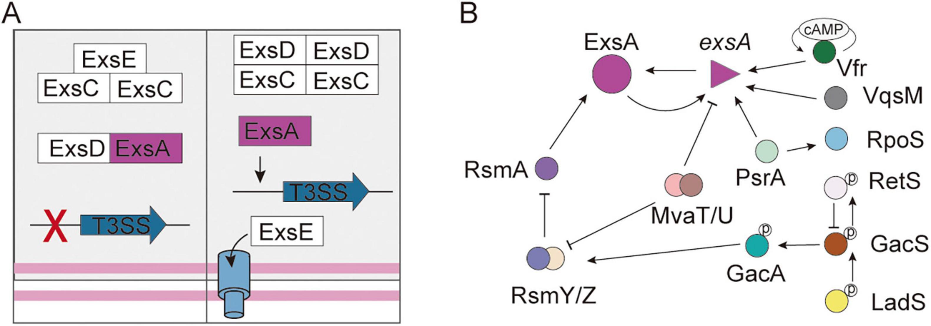 Figure 2. The regulation system of T3SS in Pseudomonas aeruginosa. (A) The partner-switching mechanism of T3SS controls the DNA-binding activity of ExsA. (B) The signaling pathways involved in the regulation of T3SS gene expression. The T-shaped arrowhead indicates inhibition. The solid arrow indicates activation.