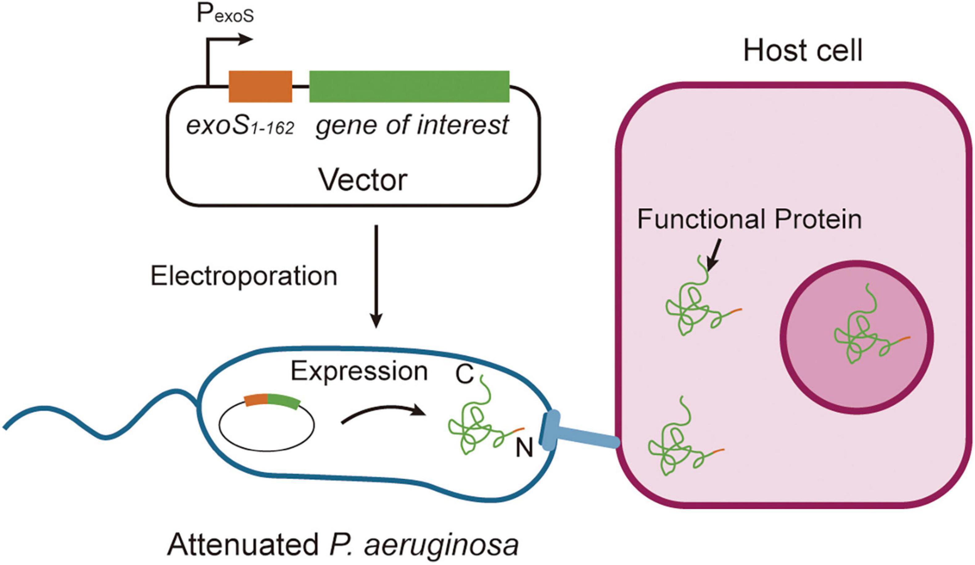 Figure 3. Strategies of functional protein secretion. Proteins of interest are fused to the ExoS1–54 secretion signal sequence and cloned into an Escherichia-Pseudomonas shuttle expression vector, which is subsequently electroporated into attenuated Pseudomonas aeruginosa. Upon bacterial contact with host cells, the chimeric proteins are efficiently injected into mammalian cells through the Type III secretion system, with secretion mediated by the ExoS1–54 signal sequence. This system enables precise delivery of recombinant proteins into eukaryotic cells through bacterial infection.