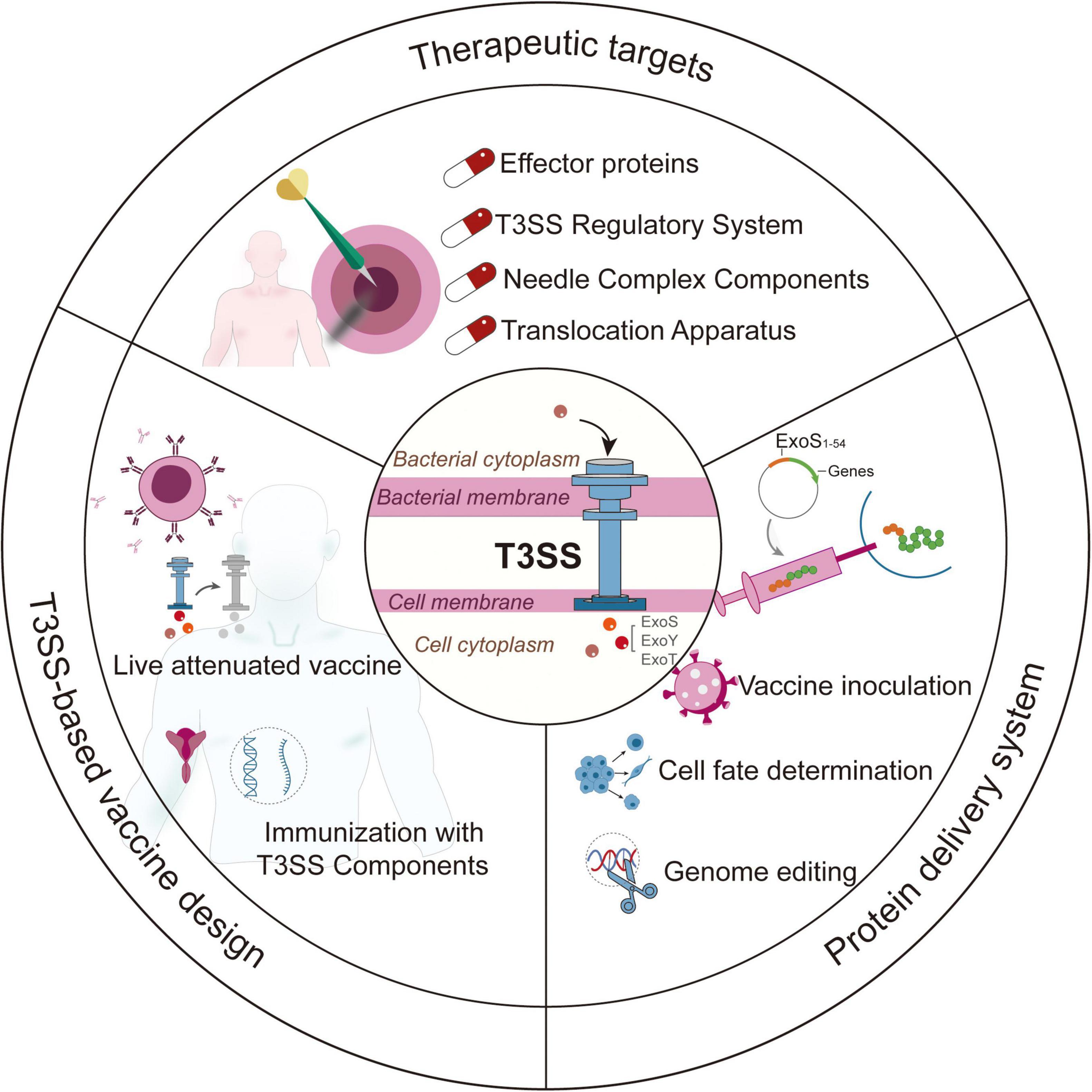 Since the identification of T3SS gene clusters in the 1990s, significant advancements have been made in understanding its structural and functional characteristics (Salmond and Reeves, 1993). Recent developments in cryo-electron microscopy, single-cell sequencing, and artificial intelligence have provided insights into the dynamic assembly of the T3SS, the networks of effector-host interactions, and the regulatory pathways involved (Abby et al., 2016; Butan et al., 2019; Horna and Ruiz, 2021b; Williams McMackin et al., 2019). Concurrently, translational applications have emerged, including T3SS-targeted inhibitors that show significant antibacterial efficacy in animal models (Berube et al., 2017; Kim et al., 2014; Luo et al., 2017; Marsden et al., 2016); T3SS-based vaccines that show protective effects in clinical trials (Das et al., 2020; Fakoor et al., 2020b; Fuentes-Valverde et al., 2022; Meynet et al., 2018); and engineered T3SS delivery systems designed to transport functional proteins (Bichsel et al., 2011; Epaulard et al., 2006; Panthel et al., 2006). Nevertheless, challenges remain, particularly concerning the heterogeneity of P. aeruginosa, the complexity of host immune responses, and barriers to clinical translation.