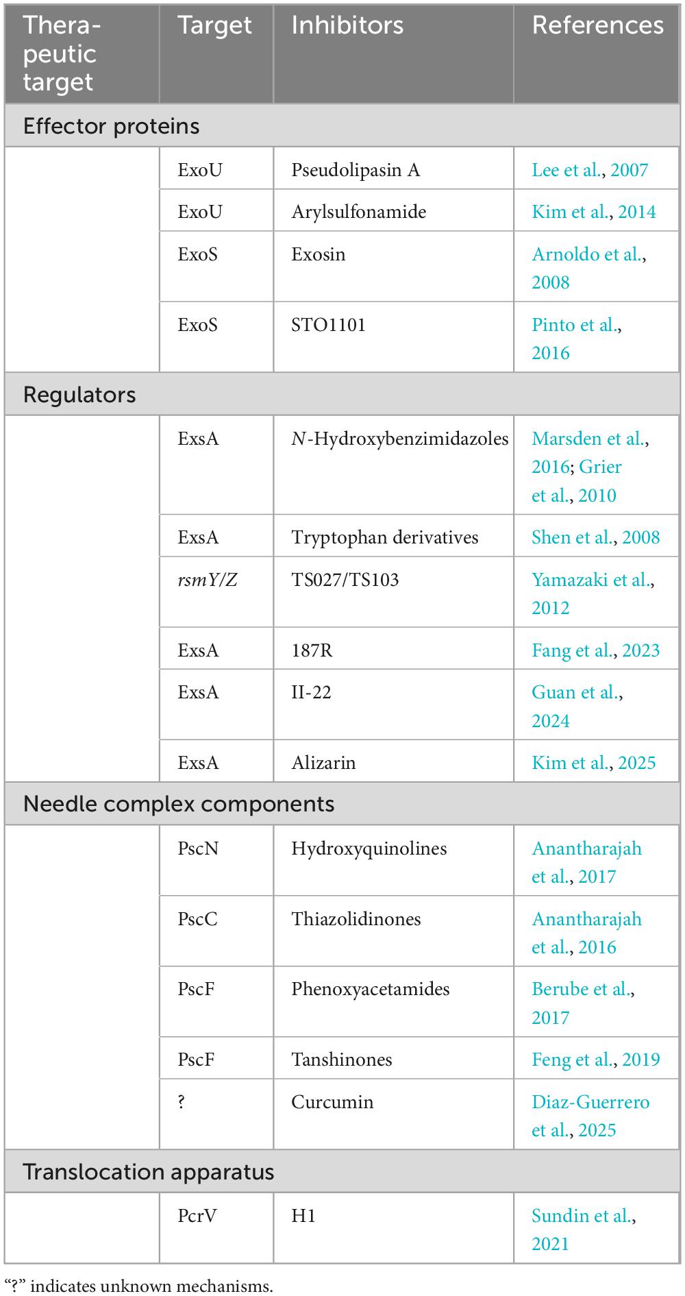 N-Hydroxybenzimidazoles (Table 1) selectively bind to the C-terminal DNA-binding domain of ExsA, inhibiting the activation of T3SS (Marsden et al., 2016; Grier et al., 2010). Shen et al. (2008) reported that tryptophan derivatives (Table 1) (e.g., indole-3-acetic acid) act as effective inhibitors of exsA transcription and T3SS expression. Recent studies have demonstrated that the inhibitory effect of alizarin, phenylamino acetamide compound 187R and Thiazole-containing aryl amide compound II-22 on T3SS is mediated through ExsA (Fang et al., 2023; Guan et al., 2024; Kim et al., 2025; Table 1). The phytochemicals TS027 and TS103 (Table 1) modulate the Rsm system by downregulating rsmY/Z, which reduces translational repression and facilitates the formation of the RsmA-ExsA complex (Yamazaki et al., 2012). While these findings are promising, they are mainly based on in vitro studies, revealing significant gaps in research (Fang et al., 2023; Guan et al., 2024; Kim et al., 2025; Shen et al., 2008; Yamazaki et al., 2012). Future work may combine structural biology and artificial intelligence for optimizing inhibitors, establish dynamic infection models to study host-pathogen interactions, and develop multi-omics-guided intervention strategies targeting epigenetic, signaling, and quorum-sensing pathways for comprehensive regulation (Horna and Ruiz, 2021a; Shreya et al., 2025).