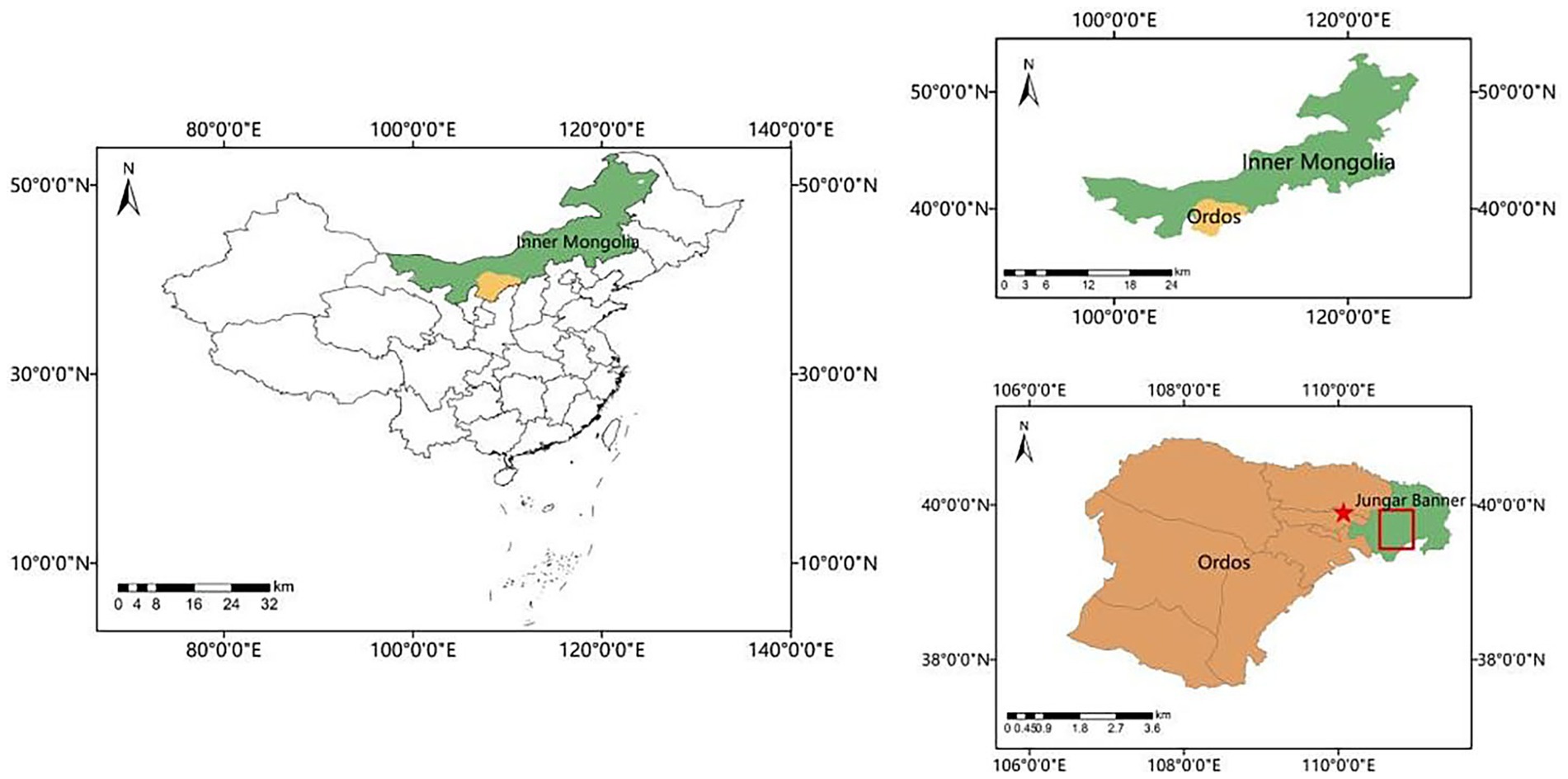 Specifically, the surface soil, rhizosphere soil from wild Medicago sativa, and the potting soil for the greenhouse experiment were all sourced from the Erlahugou watershed region in Zhungeer Banner, Ordos City (110°32′-111°06′E, 39°26′-39°56′N), as shown in Figure 1. In contrast, the reclaimed soil was collected from a separate restoration site.