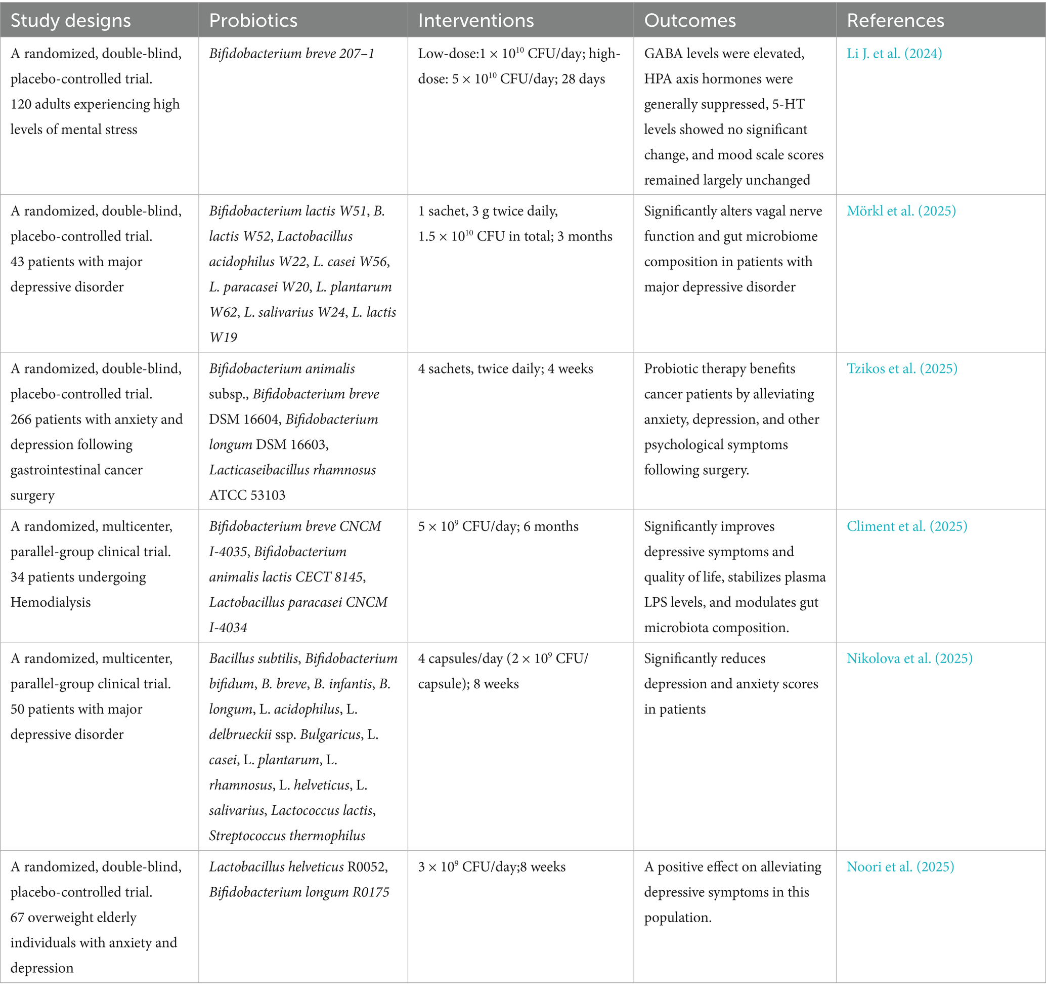 Given the correlation between gut microbiota and anxiety/depression, probiotics may alleviate symptoms by regulating dysbiosis (Jang et al., 2019). Probiotics, as a safe and well-tolerated non-pharmacological therapy, represent a promising therapeutic option for mood disorders (Merkouris et al., 2024). Research has shown that probiotics can enhance cognitive function and reduce depressive symptoms, suggesting their potential role in depression treatment (He et al., 2023). Timothy G et al. defined the concept of psycholbiotics as live microorganisms that, when ingested in sufficient quantities, confer health benefits to individuals with mental disorders. These probiotics belong to a class capable of producing and delivering neuroactive substances such as GABA, serotonin, and dopamine, thereby influencing brain function through the MGB axis (Dinan et al., 2013). Probiotic preparations commonly used in clinical practice include beneficial strains such as Lactobacillus casei, Lactobacillus acidophilus, and Bifidobacteria (Zhang et al., 2023). Research by Kirsten Tillisch et al. has demonstrated for the first time in humans that chronic consumption of fermented dairy products containing five probiotic strains—including Bifidobacterium lactis CNCM I-2494—significantly modulates the brain’s response to emotional stimuliation (Tillisch et al., 2013). In addition, Gu et al. (2020) confirmed that Lactobacillus casei exert significant antidepressant effects in rat models by regulating gut microbiota and the brain-derived neurotrophic factor-tyrosine kinase receptor (BDNF–TrkB) signaling pathway. Certain strains, such as Lactobacillus NK41, Bifidobacterium longum NK46, and their combinations, can alleviate stress-induced anxiety/depression-like behaviors. These effects involve reduced neuroinflammation (e.g., hippocampal NF-κB and microglial activation), increased neuroplasticity markers (e.g., BDNF), and improved peripheral stress/inflammation indicators (e.g., cortisol, TNF-α, and IL-6) (Han and Kim, 2019). Similarly, Sara Ferrari reported that probiotic combinations (e.g., Bifidobacterium longum novaBLG2) can mitigate glutamate-induced anxiety/depression symptoms and enhance cell survival by regulating gut-brain axis metabolites (Ferrari et al., 2024). Research also indicates that daily supplementation with Bifidobacterium breve Bif11 for 21 consecutive days can prevent LPS-induced depressive behavior in mice (Sushma et al., 2023). Bifidobacterium bifidum has demonstrated positive preventive and therapeutic effects on depression in animal models and humans (Li et al., 2023). Regarding dosage, studies have indicated that psychobiotics require a minimum daily dose of 1 billion CFU, with optimal results achieved using doses exceeding 10 billion CFU for at least 8 weeks (Jach et al., 2023). The following are partial experimental results from human studies (Table 2).