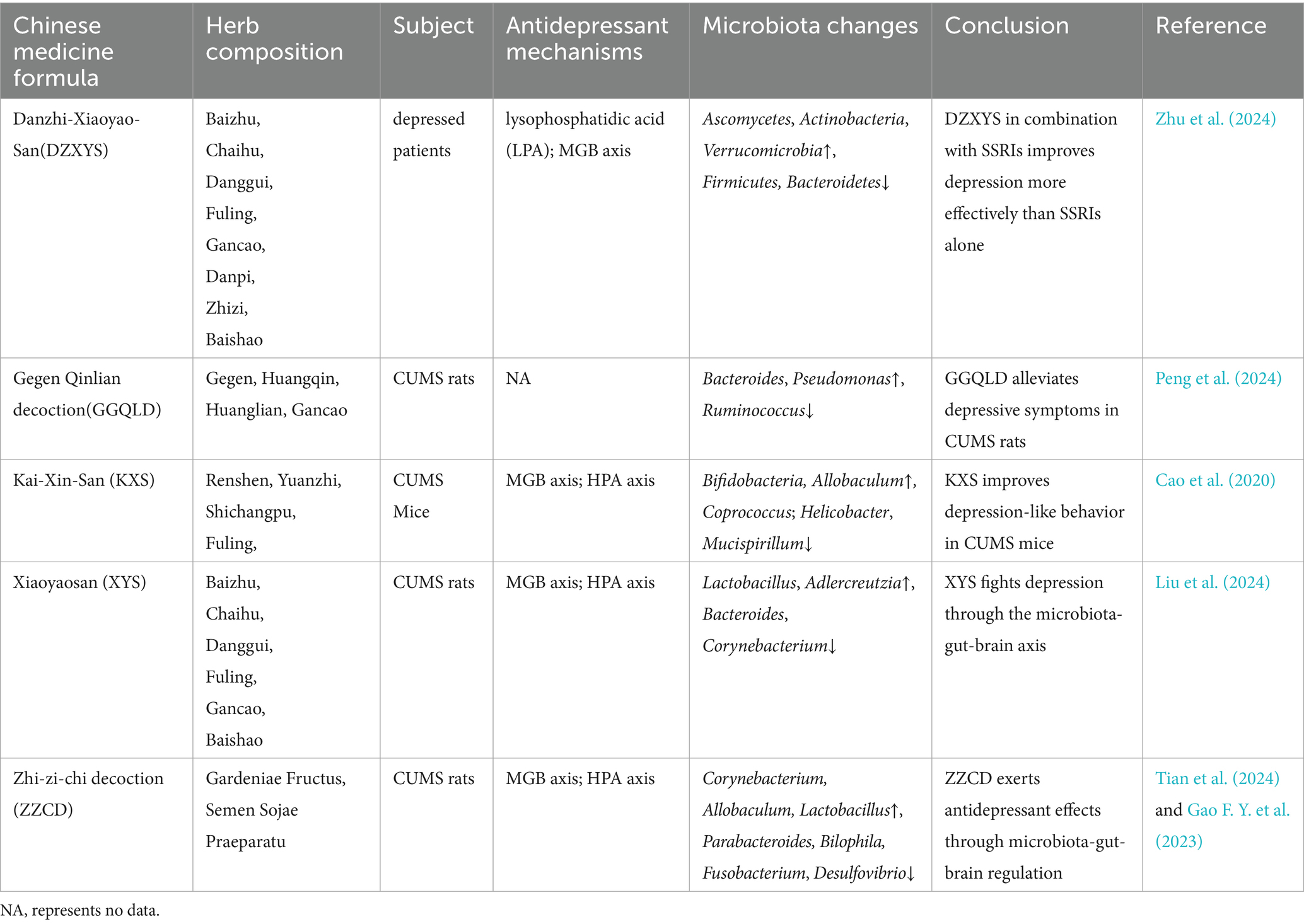In addition, TCM herbal formulas have demonstrated efficacy in treating mental illnesses, including depression and anxiety, through alterations in gut microbiota (Table 4). Research indicates that Xiaoyao San alleviates depressive-like symptoms in rats subjected to chronic unpredictable mild stress (CUMS) by modulating gut microbiota, especially, it exerts antidepressant effects by inhibiting the TLR4/NLRP3 inflammatory pathway and enhancing intestinal barrier function (Liu et al., 2024). Similarly, data confirms that Gegen Qinlian decoction significantly alleviates depression-like behaviors in CUMS rats, also by regulating gut microbiota and metabolites such as oleanolic acid (Peng et al., 2024). Li J. L. et al. (2024) evaluated the efficacy and safety of Kaixin Powder in treating depression. The results showed that KXS was comparable to or superior to antidepressants in treating depression, with fewer side effects. KXS alleviates intestinal inflammation by modulating microbiota composition and reducing LPS levels, thereby decreasing pro-inflammatory cytokines and protecting both the intestinal barrier and blood–brain barrier. Simultaneously, it lowers HPA axis hormone levels to mitigate excessive HPA axis activation, thereby improving anxiety and depression (Cao et al., 2020). Dan Zhi Xiao Yao San exerts its antidepressant effects through a multi-component, multi-target, multi-pathway mechanism. Its primary active constituents are quercetin and luteolin, with key targets including AVPR2, EGFR, F2, and CDK6. Therapeutic effects are achieved by regulating LPA and the gut microbiota-brain axis (Zhu X. et al., 2024). Zhi-zi-chi decoction not only regulates intestinal microbiota but also delivers multiple bioactive compounds (such as oleanolic acid) that act on multi-target genes. This ultimately modulates the HPA axis (by reducing CRH, ACTH, etc.), elevates neurotransmitter levels (5-HT, GABA, etc.), reduce pro-inflammatory factors (IL-1β, TNF-α), and increase anti-inflammatory factors (IL-10) to alleviate anxiety and depression (Tian et al., 2024). In summary, robust evidence supports the efficacy of TCM interventions in alleviating depression and anxiety symptoms through gut microbiota regulation.