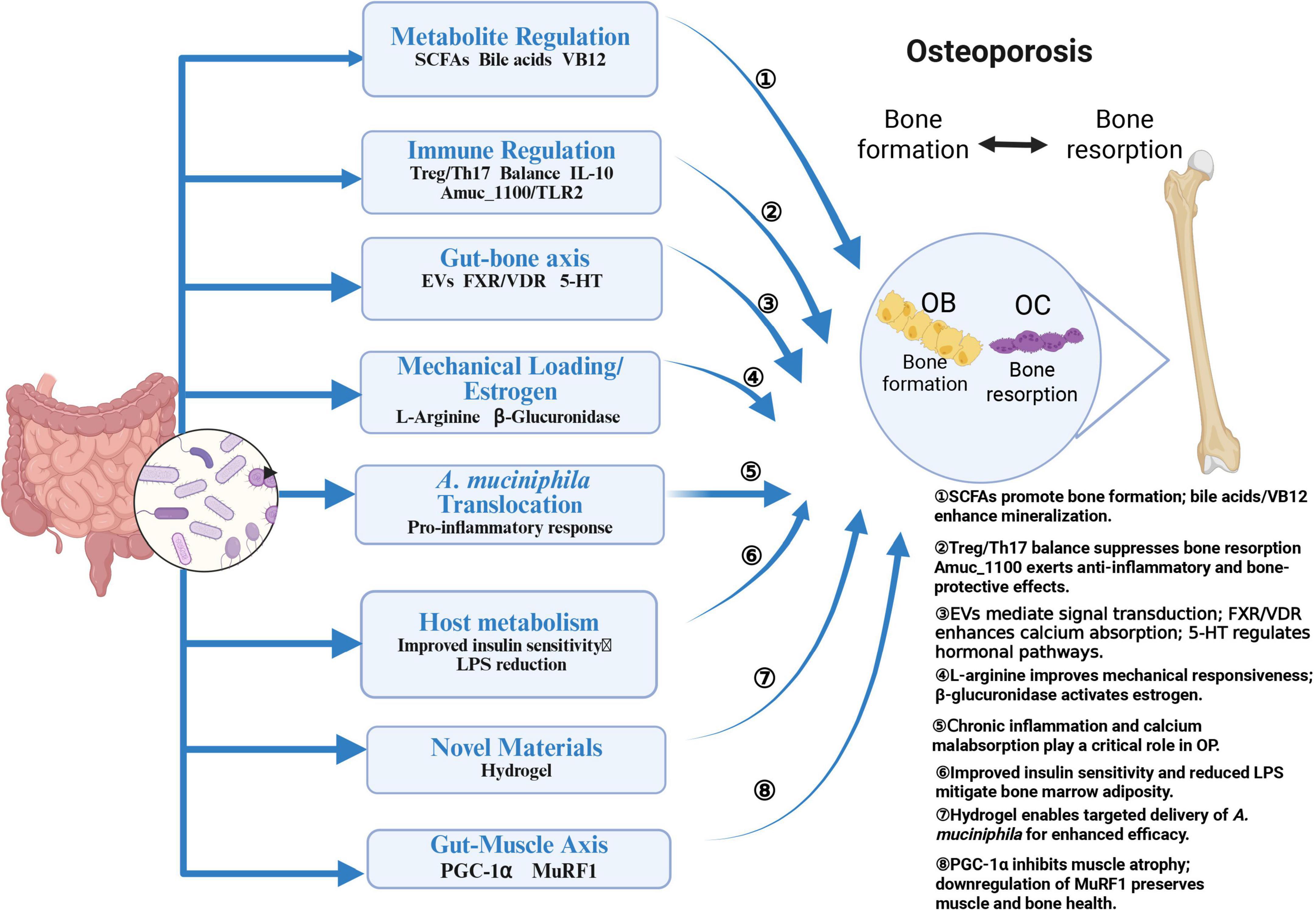 Osteoporosis pathogenesis involves gut dysbiosis, chronic inflammation, immune dysfunction, and stress responses–all of which can be targeted through GM modulation for OP management. In OP patients, the compromised intestinal barrier integrity allows bacterial translocation. This enables gut-derived bacteria and toxins to spread via systemic circulation to distant organs, including the lungs, kidneys, brain, and skeletal tissues (D’Amelio and Sassi, 2018). Such microbial translocation triggers localized and systemic inflammation, immune dysregulation, and multi-organ dysfunction, thereby worsening disease progression (Camilleri, 2019; Su et al., 2024). As a keystone species for mucosal barrier maintenance, A. muciniphila strengthens intestinal defenses through three complementary mechanisms: Stimulating mucus secretion to reinforce the physical barrier. (a) Producing β-N-acetylhexosaminidase to regulate tight junction proteins. (b) Generating SCFAs to stabilize the mucosal microenvironment (Zheng et al., 2023). (c) While direct evidence linking A. muciniphila translocation to OP prevention is still lacking, its therapeutic potential may involve site-specific microbial interactions. Further investigation through translocation-focused studies is warranted.