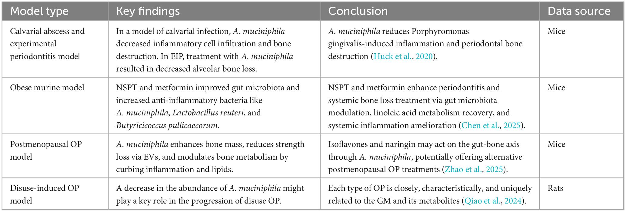 Gut microbiota exhibits complex regulatory interactions with skeletal homeostasis, and A. muciniphila abundance can be therapeutically modulated through multifaceted interventions. Dietary strategies include consuming fruits rich in proanthocyanidins (Anhê et al., 2015); probiotic co-administration (e.g., Bifidobacterium animalis subsp. lactis LMG P-28149) (Alard et al., 2016); prebiotic supplementation (such as inulin and fructooligosaccharides/FOS) (Halmos et al., 2015); and following low-FODMAP diets. Pharmacological approaches involve the use of metformin (Shin et al., 2014); herbal formulations (Neyrinck et al., 2017). Lifestyle modifications such as whole-grain consumption, fiber-rich nutrition, avoiding hyperglycemic and hyperlipidemic diets and alcohol, stress reduction, and structured exercise can synergistically enhance A. muciniphila colonization (Zeng et al., 2023). Clinically, A. muciniphila has demonstrated multifunctional therapeutic benefits, including: inducing remission in the inflammatory bowel disease (Luo et al., 2022), regulating metabolic parameters encompassing body weight, adiposity, and glycemic control (Zhang X. et al., 2025), and enhancing chemotherapeutic sensitivity in gastric carcinoma management (Xu et al., 2024). Notably, a randomized double-blind trial by Depommier et al. (2019) demonstrated that pasteurized A. muciniphila (heat-inactivated) was more effective than viable counterparts in improving insulin resistance in obese individuals, a finding supported by preclinical models (Depommier et al., 2020). Preclinical evidence specific to OP, including details of animal models, and key outcomes related to A. muciniphila, is summarized in Table 1.