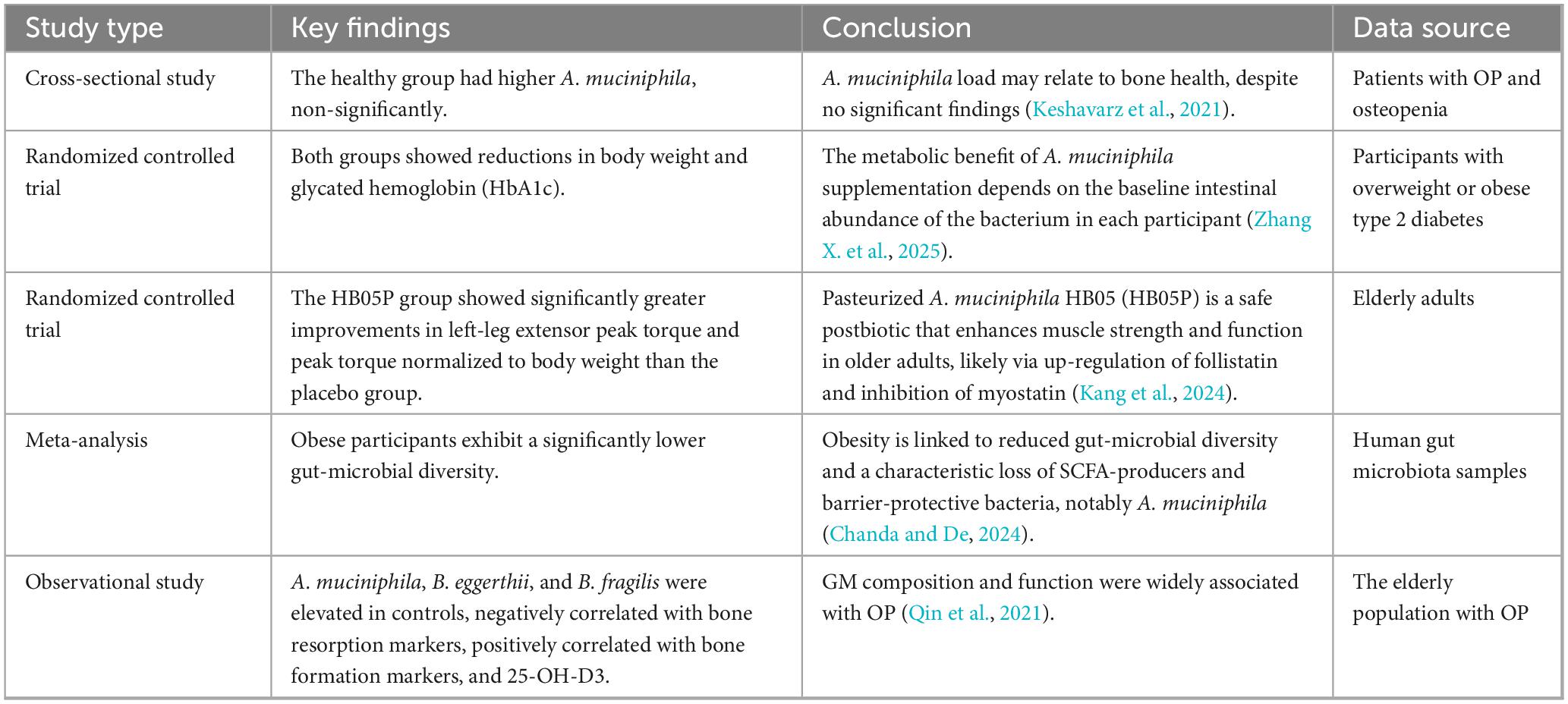 Emerging evidence highlights the therapeutic potential of A. muciniphila for obesity, OP, and sarcopenia (Deng et al., 2020; Byeon et al., 2022). Table 2 compiles evidence linking A. muciniphila to therapeutic effects in obesity, OP, and sarcopenia. OP patients have been found to have lower A. muciniphila levels than those in healthy controls (Keshavarz et al., 2021; Wang et al., 2022). Hong et al. (2024) underscored the critical interplay between host microbial genetics and therapeutic outcomes, advocating for pharmacogenomic-guided personalization of A. muciniphila-targeted regimens. Current research focuses on developing A. muciniphila-derived formulations, including live biotherapeutics, synthetic propionate analogs, and postbiotic nano-delivery systems, to enhance the prevention of OP through dietary interventions. However, optimizing these therapies will require thorough dose-response characterization and long-term safety validation across diverse populations. However, Okoro et al. (2023) identified negative correlations between A. muciniphila abundance and radial/tibial BMD across two independent cohorts. Notably, existing studies on the association between A. muciniphila and BMD are currently limited to observational correlations, and no definitive causal relationships have been established. The directionality of the association (e.g., whether A. muciniphila directly influences bone metabolism or reflects secondary changes in systemic homeostasis) and underlying mechanisms require further investigation through interventional studies or mechanistic experiments.