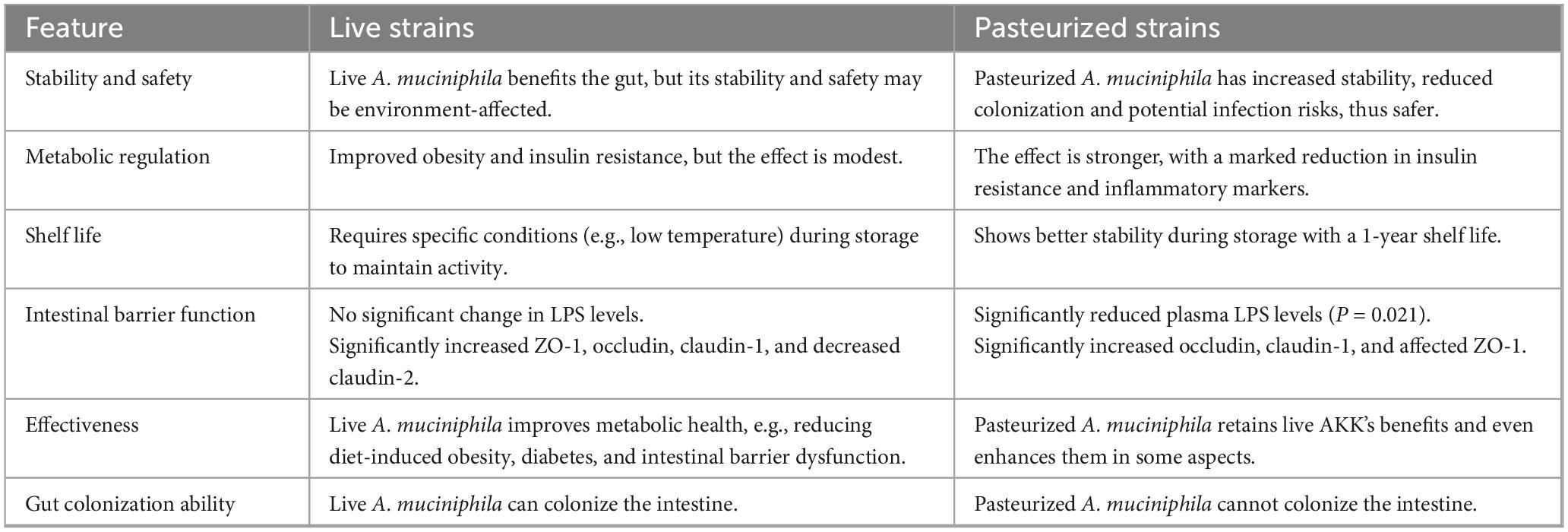 While no direct adverse effects related to OP have been reported, the dual nature of A. muciniphila therapy necessitates a precision framework that integrates microbial dynamics, host genetics, and disease pathophysiology. As noted in a Cell Metabolism editorial: “Microbes are not pills–their value lies in ecosystem equilibration rather than isolated pharmacodynamics.” Developing a trilogic “microbe-host-disease” intervention system will be crucial to maximizing A. muciniphila’s therapeutic potential while minimizing ecological risks. To provide a clear comparison of the characteristics and potential impacts of live and pasteurized strains, the following Table 3 summarizes the differences between the two across several key aspects (Depommier et al., 2019; Ashrafian et al., 2021; Druart et al., 2021; EFSA Panel on Nutrition, Novel Foods and Food Allergens (NDA) et al., 2021).
