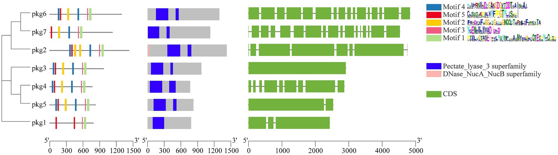 The domains, motifs, and gene structures of the seven GH55 family sequences were predicted (Figure 1). The results showed that all sequences contained the Pectate_lyase_3 superfamily domain. In addition, only pkg1 contained one conserved domain, and only pkg2 had a DNase_NucA_NucB domain. All sequences contained Motif1, Motif3, and Motif5. Only pkg1 did not contain Motif2 and Motif4. In the cluster analysis, pkg1 was also a special sequence. Among the seven sequences, pkg6 and pkg7 contained 16 and 17 exons, respectively, while pkg3 did not contain introns. The NCBI BLAST result showed that only pkg1 in PG52 belonged to the endo-β-1,3-glucanase family.
