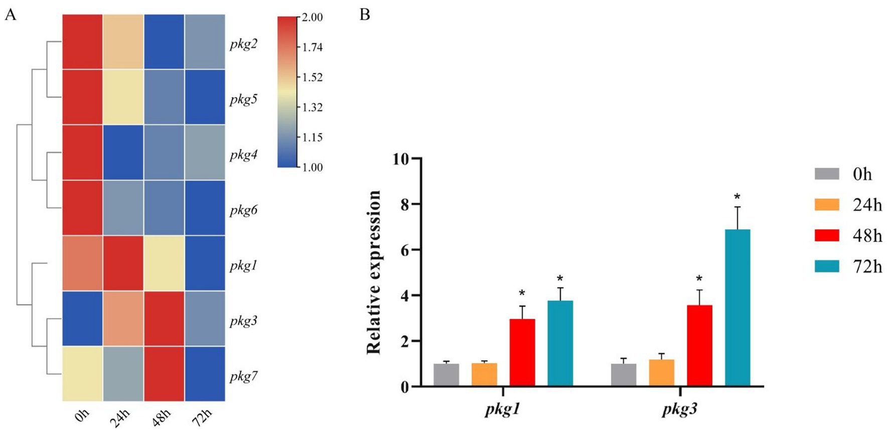 Figure 2. Expression pattern of the pkg genes under aeciospore induction. (A) Transcriptome FPKM results for the pkg genes under aeciospore induction, n = 3; (B) RT-qPCR results for pkg1 and pkg3, n = 3, *p < 0.05.