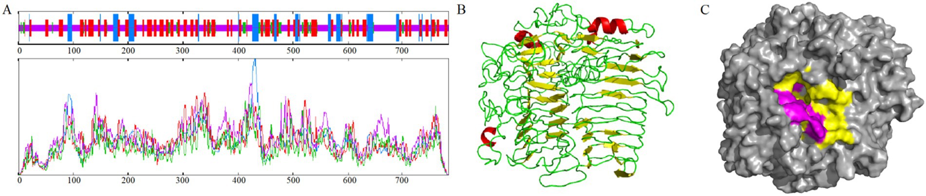 Figure 3. Sequence and structural analysis of PKG1. (A) Prediction of the PKG1 secondary structure sequence. (B) Prediction of the 3D structure of PKG1; yellow represents β-sheet, red represents α-helix, green represents loop. (C) Predicted substrate-binding cleft of PKG1; yellow represents the substrate-binding groove; purple represents the aromatic blocks.