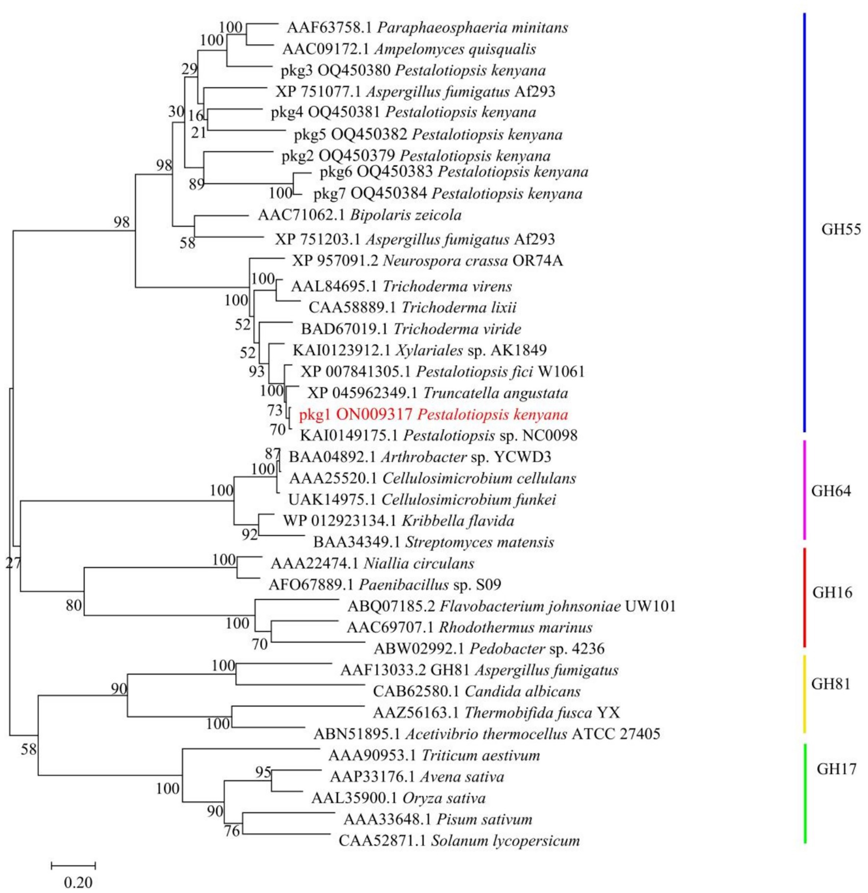 The seven GH55 family sequences were clustered with glucanase sequences from other known families, and the results showed that the candidate sequence pkg1 was located in the branch of the GH55 family (Figure 4). Among them, in the phylogenetic tree, the Pestalotiopsis sp. NC0098 glucanase sequence homology was highest. The cluster analysis of the amino acid sequences within the GH55 family showed that only pkg1 belonged to endo-β-1, 3-glucanase among the seven pkg. genes, and this is consistent with previous results.