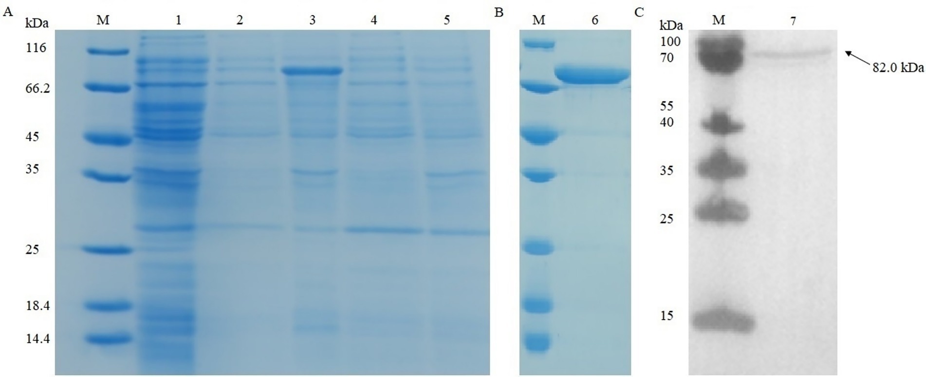 Figure 5. SDS-PAGE and Western blot analysis of recombinant PKG1. Recombinant protein expression analysis in (A). Purified recombinant protein in (B). Western blot analysis results of the supernatant induced at 15 °C in (C). M: protein marker; 1: uninduced sample; 2: supernatant induced at 15 °C; 3: precipitation induced at 15 °C; 4: supernatant induced at 37 °C; 5: precipitation induced at 37 °C; 6: final purified protein; 7: supernatant induced at 15 °C.