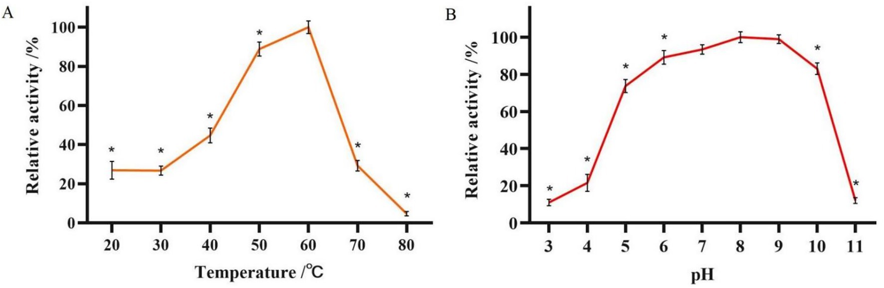Figure 6. Determination of the optimum temperature and pH of the PKG1 protein. (A) Relative enzyme activity of PKG1 at various temperatures at pH 5.0. (B) The relative enzyme activity of PKG1 at different pH levels at 25 °C. n = 3, *p < 0.05.