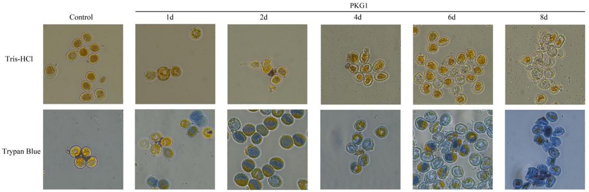 Figure 7. Destructive effects of PKG1 on the cell walls of aeciospores (25 °C). The living aeciospores and contents appear yellow, and the dead aeciospores are stained blue by trypan blue.