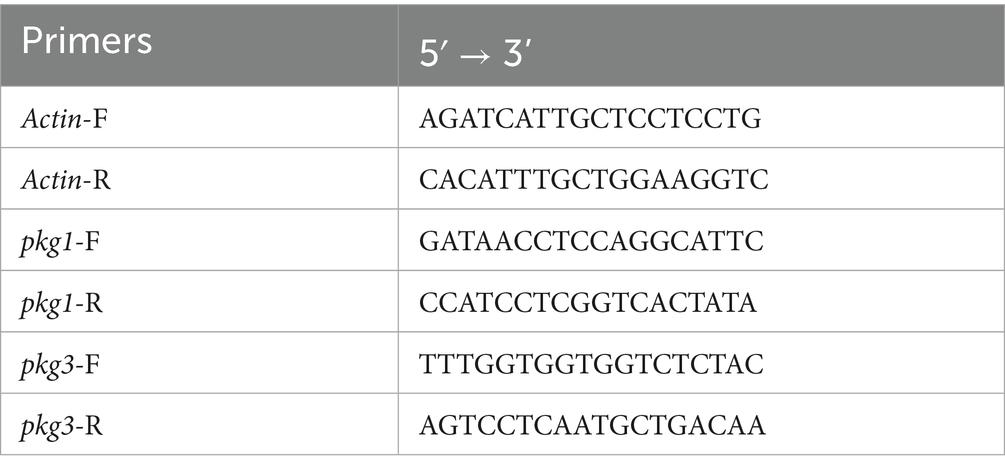 A recombinant PKG1 protein was generated by transforming the E. coli Rosetta (DE3) strain with pET28a-pkg1 or pET28a (+) (empty vector control). The recombinant plasmid pET28a-pkg1 was transformed into E. coli Rosetta (DE3) competent cells, which were then spread on a plate with kanamycin (30 μg/mL) after heat shock at 42 °C. Single colonies were randomly selected and inoculated in LB liquid medium supplemented with kanamycin (30 μg/mL). When the OD₆₀₀ reached 0.6, 0.5 mM IPTG was added to the LB medium, and the cultures were incubated at 15 °C overnight or 37 °C for 6 h. Uninduced cultures served as negative controls.