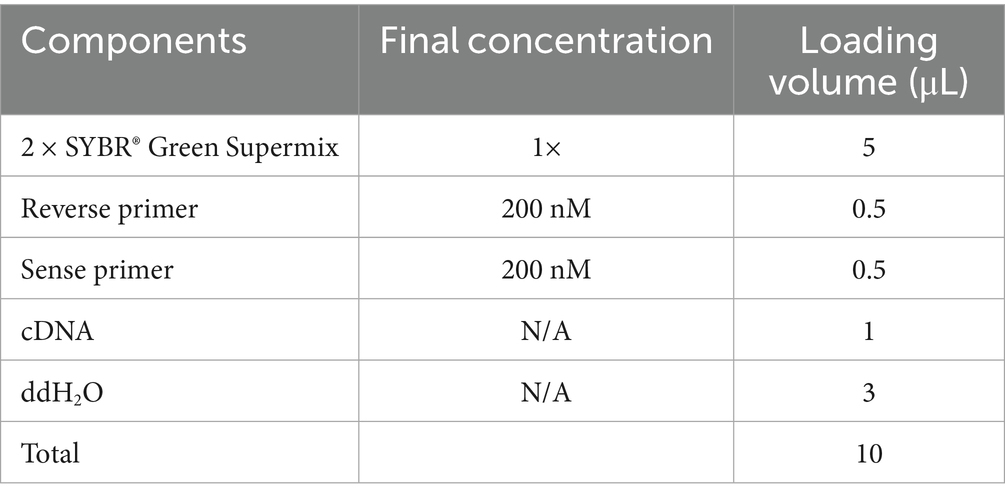 After induction by aeciospores, the expression of the GH55 family genes was preliminarily analyzed with reference to the transcriptome results (Mei et al., 2022). The genes with high expression levels and significant expression changes were selected for real-time quantitative PCR (RT-qPCR). Total RNA was extracted from PG52 mycelium induced by aeciospores at different time points, and it was reverse transcribed to synthesize cDNA after verifying its integrity and purity. Using specific primers (Table 1) with a 10 μL reaction system (containing 5 μL of 2 × SYBR® Green Supermix, 0.5 μL of each forward and reverse primer, 1 μL of cDNA, and 3 μL of ddH₂O), amplification on a PCR instrument was performed with pre-denaturation at 95 °C for 30 s, followed by 40 cycles (denaturation at 95 °C for 5 s, annealing at 58 °C for 30 s, and extension at 72 °C for 30 s), including three technical replicates and melting curve analysis. The relative expression level was calculated using the 2−ΔΔCT method, with Actin as the internal reference, and differences were analyzed using SPSS 26.0. The stable expression gene, Actin (XM_007836323.1), was used as an internal reference gene for the normalization of mRNA levels in this experiment; primer sequences are listed in Table 1, while the qPCR components and volumes are detailed in Table 2.