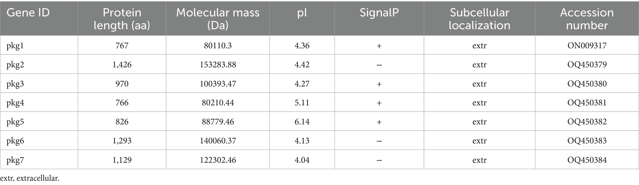 A total of seven GH55 family genes were identified from the PG52 genome (Table 3). The protein length varied from 766 amino acid (aa) residues (pkg4) to 1,426 aa (pkg2). Their molecular weights were 80.11–153.28 kDa. The pI values of the proteins encoded by pkg1 to pkg7 ranged from 4.04 to 6.14. Most of these proteins showed relatively acidic pI values, with five proteins (pkg1, pkg2, pkg3, pkg6, and pkg7) having pI values below 4.5. Only pkg4 (5.11) and pkg5 (6.14) exhibited slightly higher, yet still acidic to neutral-leaning pI values. All proteins were stable and extracellular. Four pkg genes contained signal peptide regions.