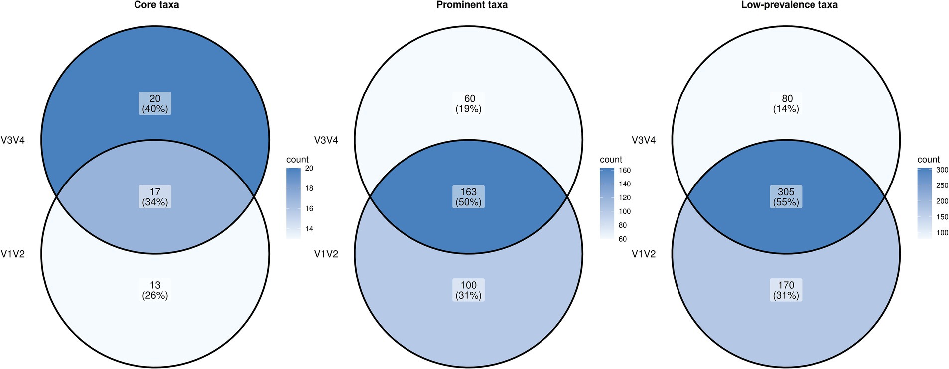 Figure 2. Venn diagram showing the intersection of the core, prominent and low-prevalence microbial taxa between V1V2 and V3V4 datasets.