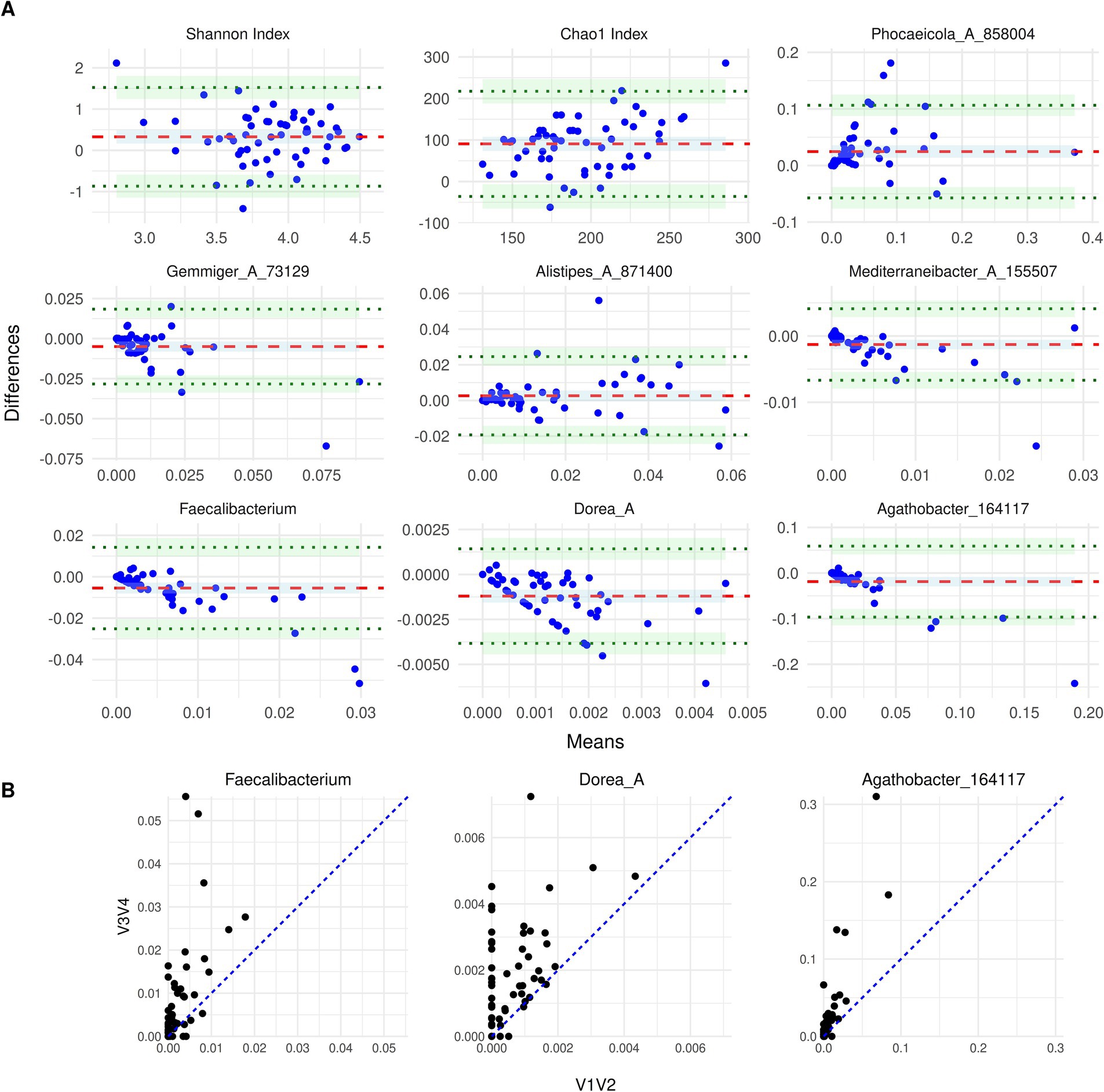 Figure 3. (A) Bland–Altman plots of genera at T0. The BA plots compare the taxon abundance between the two sequencing regions: V1V2 and V3V4. The subplots display a specific taxon or alpha diversity measure, where the x-axis denotes the mean abundance of the two methods and the y-axis denotes the difference between the two (V3V4 - V1V2). The red dashed line indicates the mean difference (bias), and the green dotted lines represent the limits of agreement. (B) Scatterplot of abundances for Faecalibacterium, Dorea_A and Agathobacter_164117 from the V1V2 and V3V4 datasets. The blue identity line (y = x) denotes the ideal case of perfect agreement and deviations from this line reflect differences between the relative abundances from the two regions.