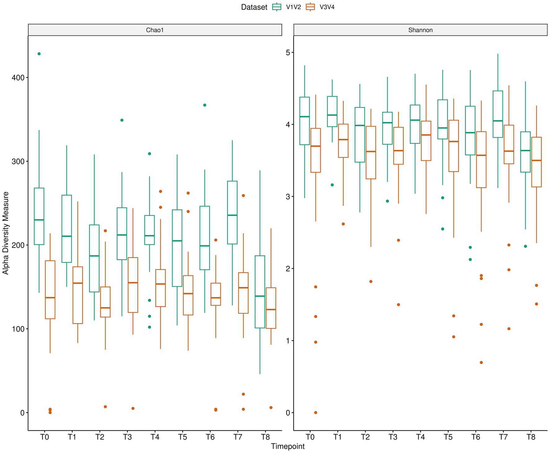 We also looked at the relative agreement between V1V2 and V3V4 for alpha diversity indices, Shannon and Chao1 at different timepoints (Figure 4). The BA plots for the Shannon Index (Supplementary Figure S3) at various timepoints did not demonstrate a consistent measurement between V1V2 and V3V4 datasets, although the bias typically neared zero for a majority of the timepoints. Nevertheless, some heteroscedasticity was observed, especially at T8, where differences seem to rise slightly at lower Shannon diversity values. The LOAs were relatively wide, reflecting a weak concordance between the two methods over time. Looking at the Chao1 index (Supplementary Figure S3), the differences between V1V2 and V3V4 data seem to be greater and exhibit more variability than those of the Shannon Index. The average bias remains positively skewed, with the Chao1 index consistently estimating higher richness values. Furthermore, the data points were more dispersed in comparison to the Shannon index. Overall, although both indices showed some degree of consistency between V1V2 and V3V4 datasets, the Chao1 index has greater variability and a more noticeable systematic bias than Shannon.