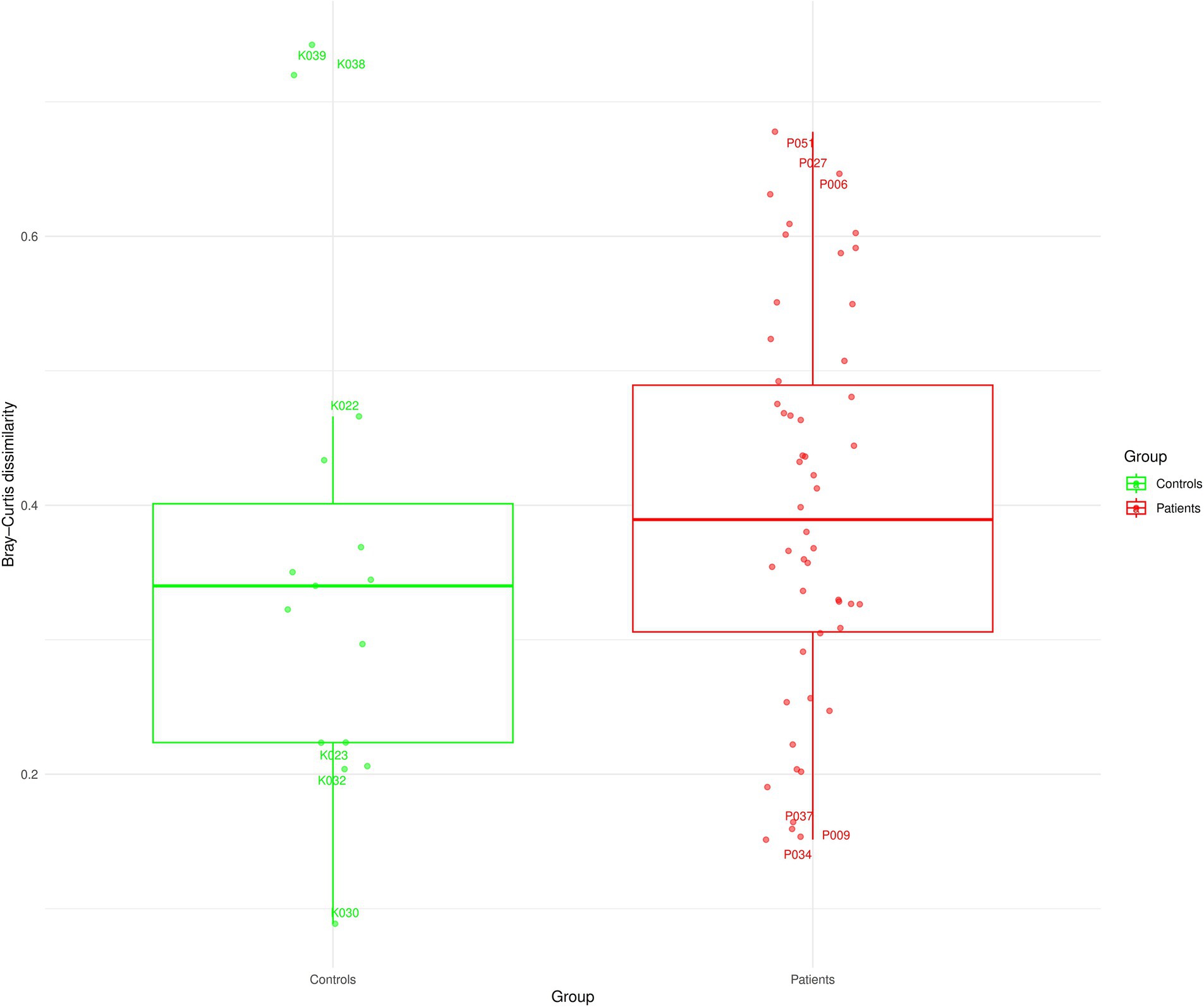 Figure 5. Distance-based analysis based on overall microbiome profiles of patients and controls at the genus level. Each boxplot summarises the within-sample distances (Bray–Curtis) of microbial relative abundances obtained from V1V2 and V3V4 regions, respectively.