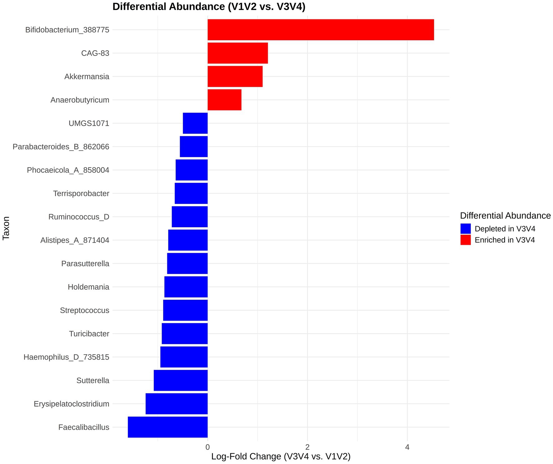 We used the ANCOM-BC2 (Lin and Peddada, 2024) methodology to perform differential abundance analysis to compare the V1V2 and V3V4 datasets at the genus level using all available timepoints for the patient group. A total of 18 genera were identified as significantly differentially abundant after correcting for multiple testing (Figure 6). It is worth noting that since these were the same samples, the differentially abundant taxa reflect the fact that specific taxa were picked up systematically differently by either of the primers used for library preparation. The genera Bifidobacterium_388775, CAG-83, Akkermansia, and Anaerobutyricum appeared to be enriched when the V3V4 region was considered. Of these Bifidobacterium_388775 showed the maximum log fold change, indicating that it is substantially more abundant in the V3V4 region data than in V1V2 data. On the other hand, taxa like Sutterella, Haemophilus_D_735815, Turicibacter, Faecalibacillus, Erysipelatoclostridium and Streptococcus were depleted in V3V4 datasets hinting at the possibility that the V1V2 region might be better able to represent these taxa.