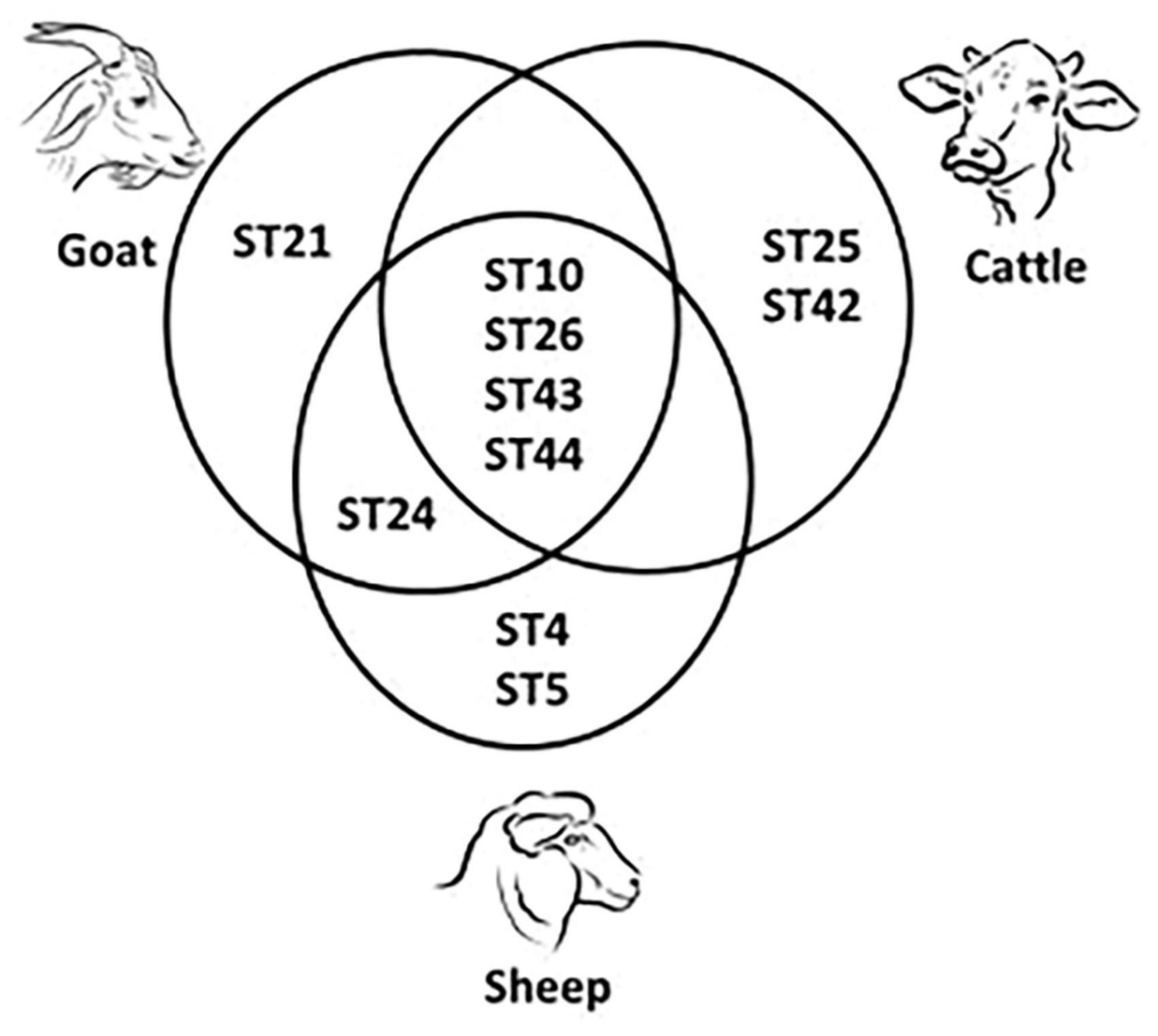 Venn diagram illustrating the distribution of subtype among goats, cattle, and sheep. Three overlapping circles represent each animal. Goat: ST21, ST24. Cattle: ST25, ST42. Sheep: ST4, ST5. Shared: ST10, ST26, ST43, ST44.