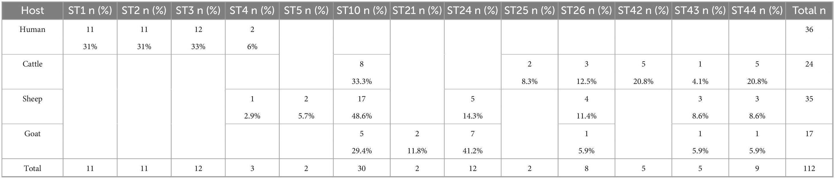 In total, 112 sequences were subtyped from humans (n = 36), cattle (n = 24), sheep (n = 35) and goat (n = 17). In multiple instances the chromoatograms showed evidence of mixed infections, as indicated by multiple peaks. To assign subtype the criteria below were followed: reasonably good quality sequence of over 300 bp and over 98% similarity in GenBank. Subtypes were identified using a combination of phylogeny and blast against GenBank and the curated database pubmlst1 and phylogeny (Supplementary Figure 3). In the phylogenetic analysis all subtypes were monophyletic and the new sequences placed within known subtype clades. For 18 sequences, the methodologies did not agree. In pubmlst, they were identified as belonging to one of the subtypes previously comprising ST10 (i.e., ST23, ST42-ST44), perhaps due to the short length of the sequences. In the phylogenetic tree, these placed within the clade comprising ST10 in the past, but jumped within the clade depending on taxon sampling. Of these, 13 were from cattle, three from sheep and two from goats. These sequences were not assigned a subtype, only the clade with which they cluster.