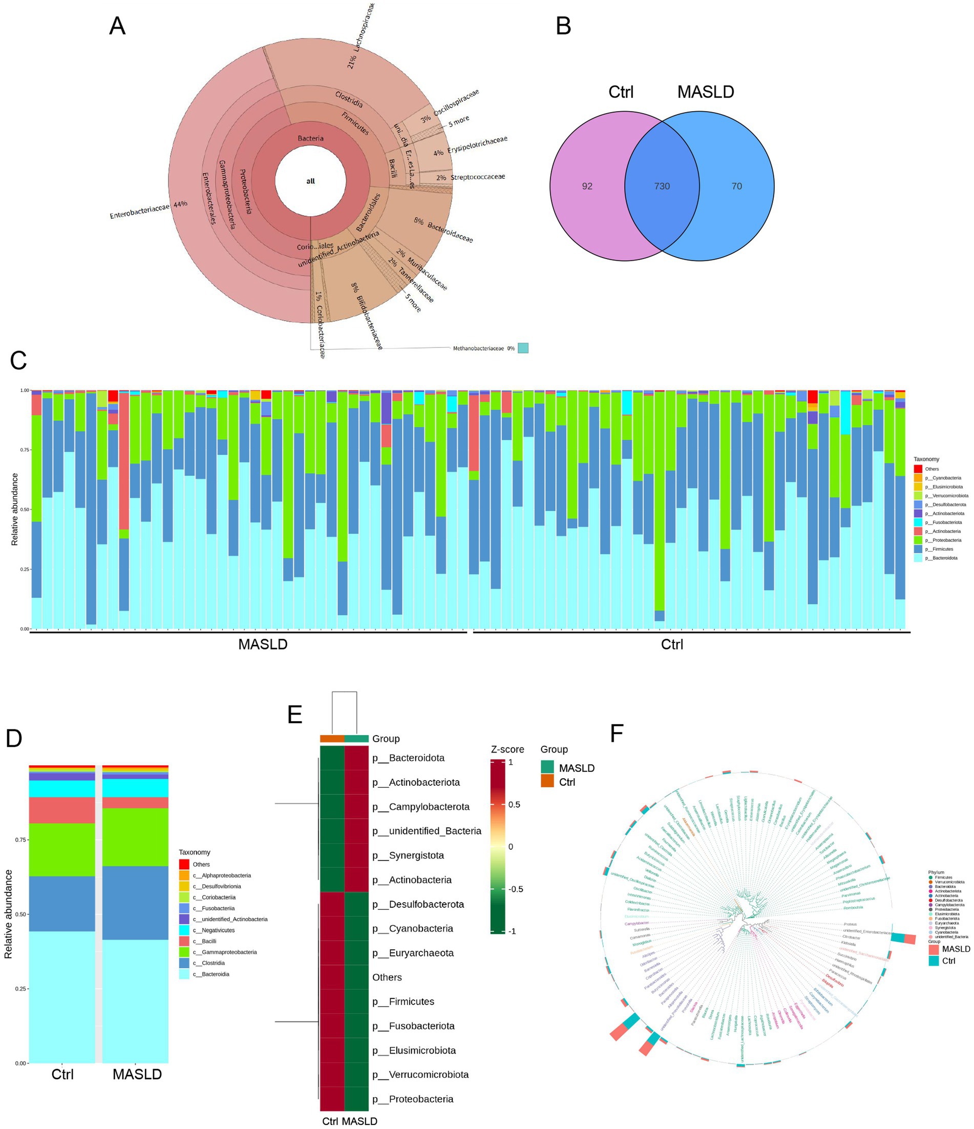 Figure 1. Overall gut microbiota abundance maps: (A) Distribution of gut microbiota species composition in 80 samples; (B) Venn diagram of gut microbiota in the Ctrl and MASLD groups; (C) Stacked bar chart of species relative abundance at the phylum level for each sample in the Ctrl and MASLD groups; (D) Stacked bar chart of species relative abundance at the phylum level in the Ctrl and MASLD groups; (E) Heatmap of species abundance at the phylum level based on ASV for different groups in the Ctrl and MASLD groups; (F) Phylogenetic relationships of species at the genus level based on ASV in the gut microbiota of the Ctrl and MASLD groups.