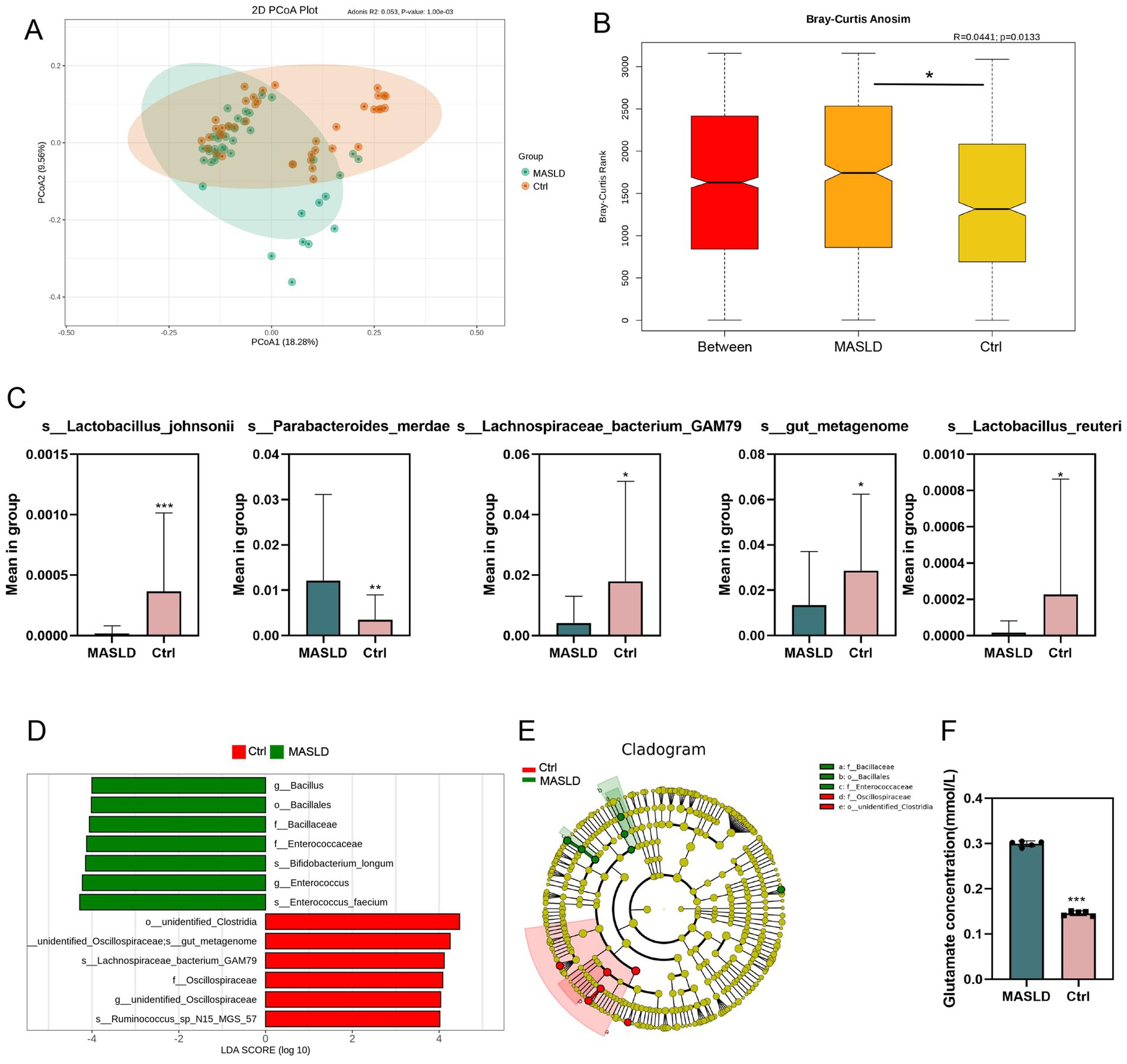 Figure 2. Differential microbiota maps of gut microbiota in MASLD: (A) PCoA plot of the Ctrl and MASLD groups; (B) Anosim analysis based on ASV between the Ctrl and MASLD groups; (C) Bar chart of species differences analysis based on ASV between the MASLD and Ctrl groups; (D) Bar chart of LEfSe based on ASV between the MASLD and Ctrl groups; (E) Phylogenetic tree based on ASV between the MASLD and Ctrl groups; (F) The concentration of glutamate in MASLD and Ctrl group.