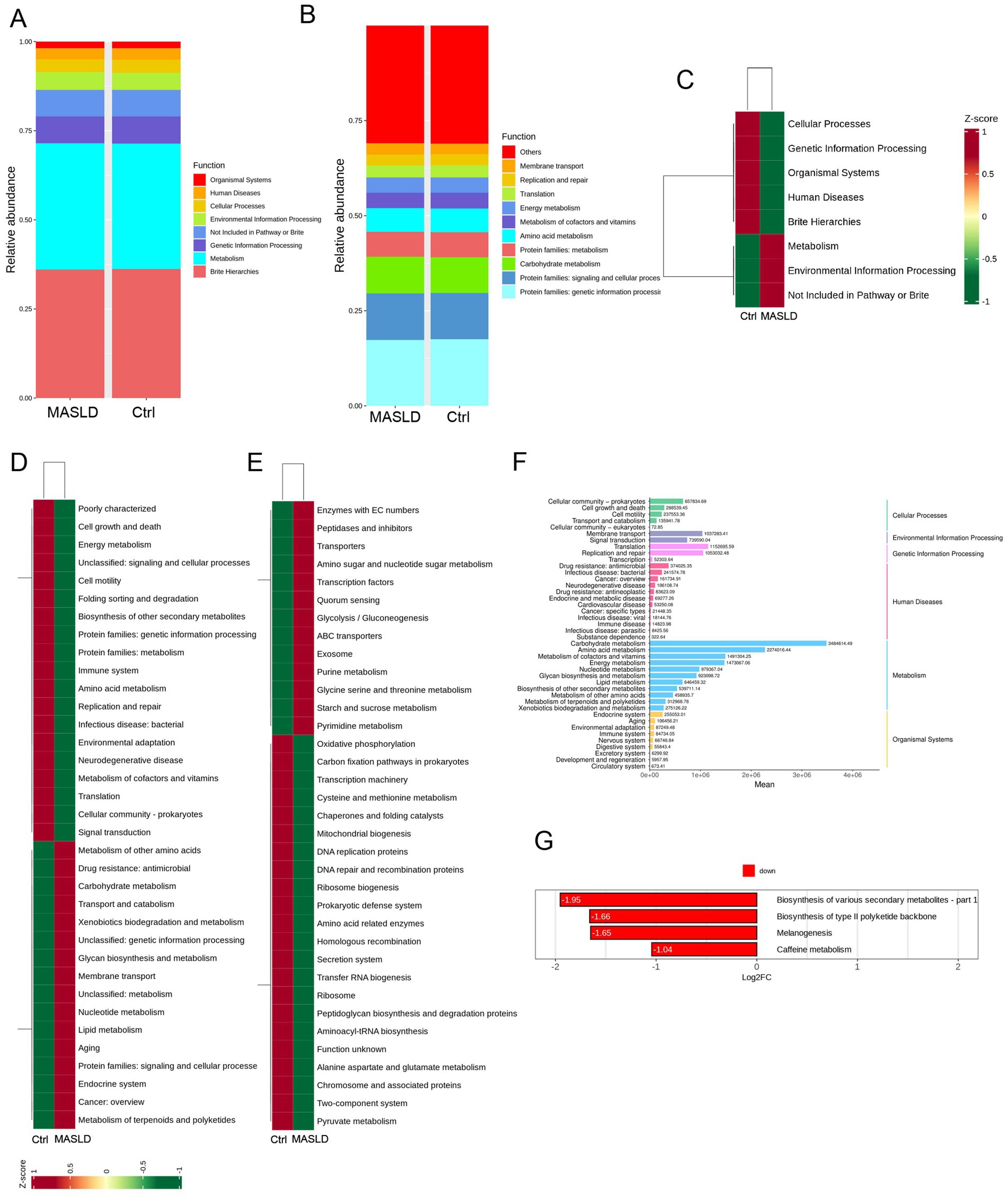 Figure 3. Functional prediction of gut microbiota in MASLD: (A) Bar chart of the top 10 most abundant function information distribution (level 1) between the MASLD and Ctrl groups; (B) Bar chart of the top 10 most abundant function information distribution (level 2) between the MASLD and Ctrl groups; (C) KEGG pathway enrichment analysis (level 1) between the MASLD and Ctrl groups; (D) KEGG pathway enrichment analysis (level 2) between the MASLD and Ctrl groups; (E) KEGG pathway enrichment analysis (level 3) between the MASLD and Ctrl groups; (F) Bar chart of enriched metabolic pathways in the MASLD group; (G) Bar chart of downregulated pathways in the Ctrl group.